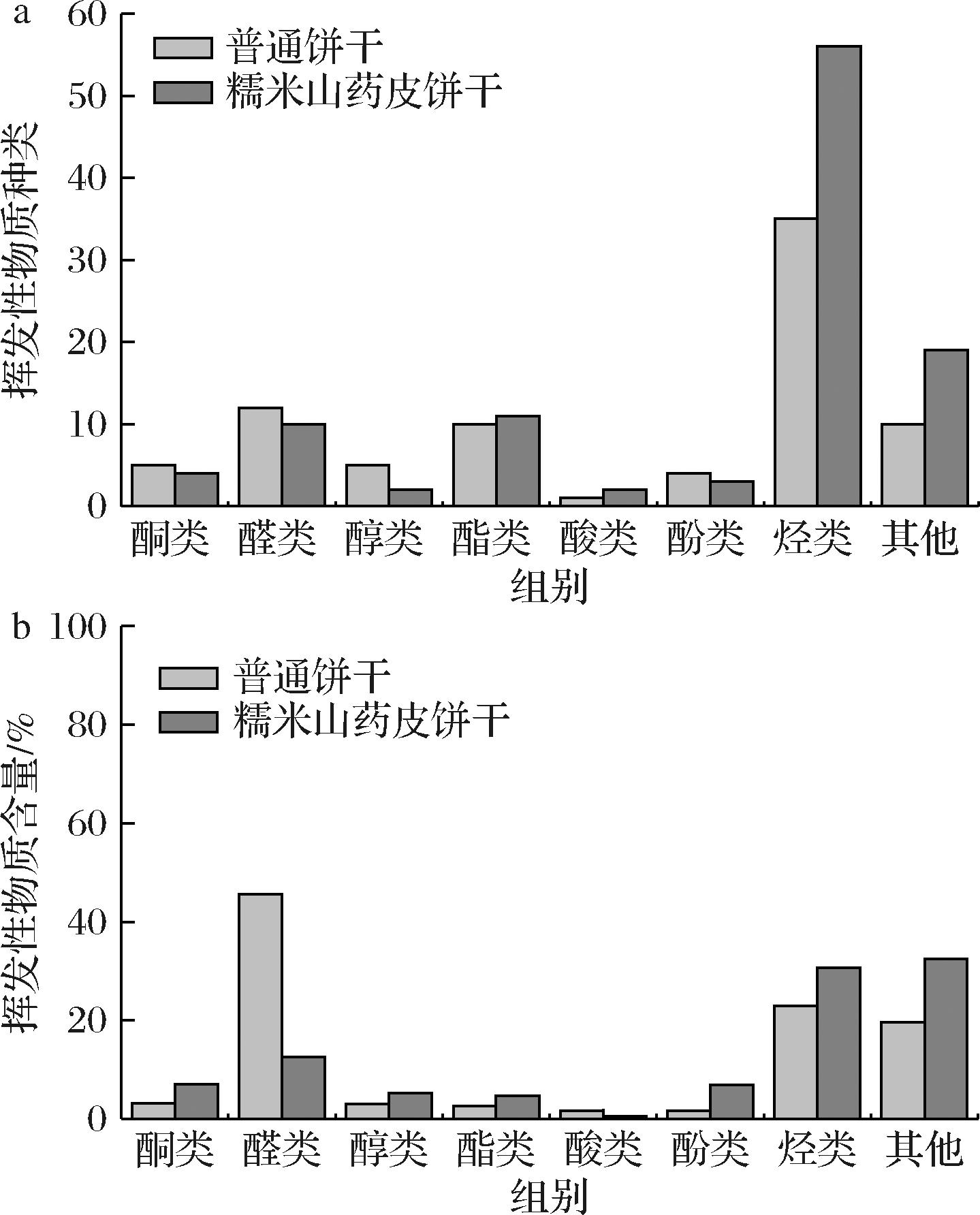 对检测出的挥发性物质进行分类,如图6所示,添加糯米山药皮后,饼干样品中酮类、醛类、醇类及酚类挥发性化合物数量减少,酯类、酸类、烃类及其他挥发性化合物数量增加,且增加数量相较于减少数量大,表明糯米山药皮的添加能够显著丰富饼干样品的风味,可能原因是糯米山药皮本身具有特殊的风味成分,也可能糯米山药皮在发酵、烘焙等过程中产生特殊的风味化合物。
