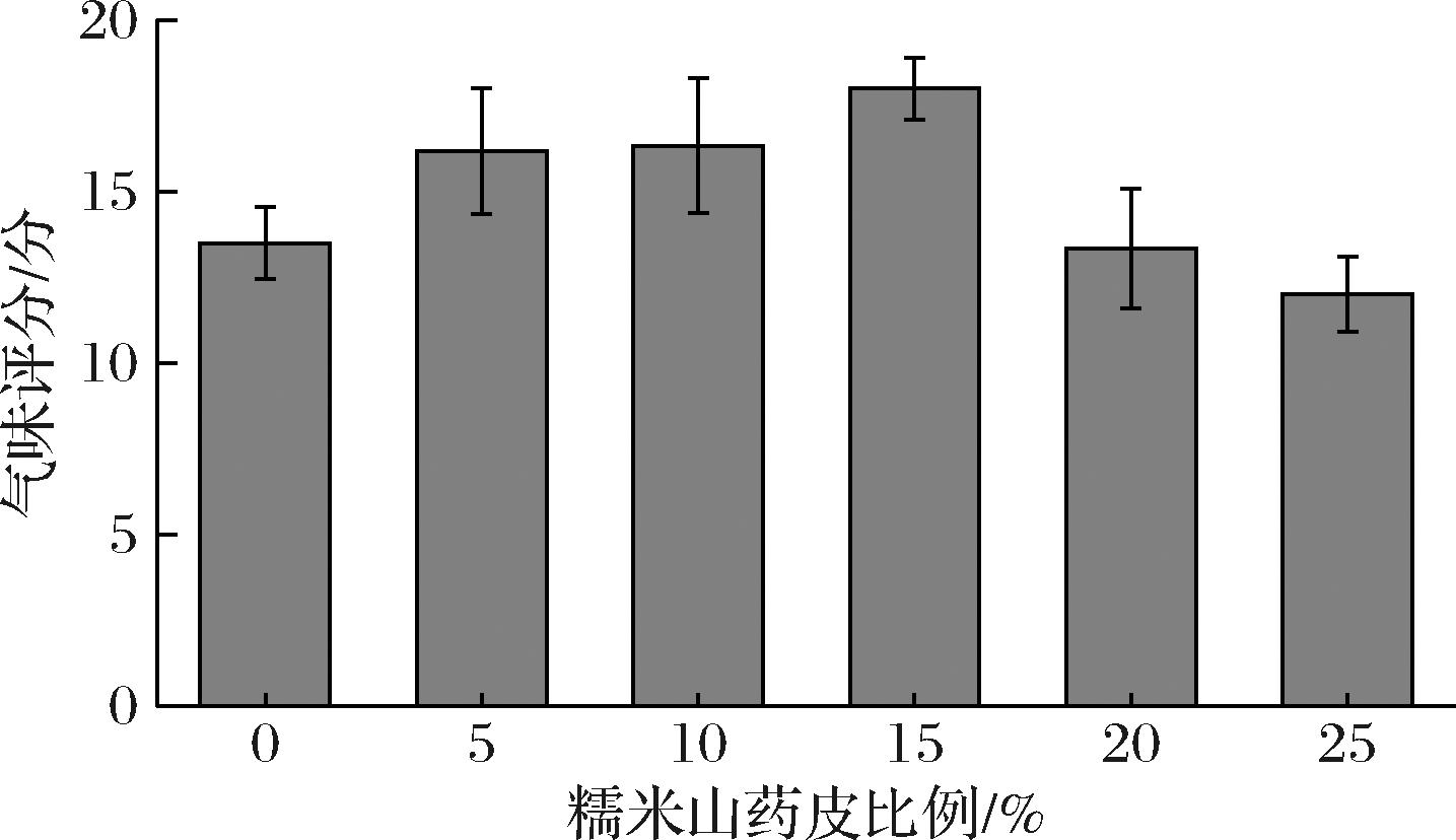 对不同糯米山药皮添加比例的饼干样品进行感官评价,结果显示6组饼干在色泽、口感、形态、组织4个方面的感官评分均无显著性差异,在气味方面的感官评分具有显著性差异。由图4可知,添加5%、10%、15%的糯米山药皮使得饼干样品在气味感官评价上得分提高,6组饼干样品在气味感官评价上具有显著性差异(P<0.05)。糯米山药皮饼干样品的气味评价更好可能是因为糯米山药皮本身具有特殊的香气成分,或发酵及烘焙过程中糯米山药皮产生特殊的香味物质,或糯米山药皮与其他原料在发酵或焙烤过程中相互作用从而产生特殊的香气成分。刘砚耕等[20]的研究也发现添加一定量的山药皮粉会对馒头的气味品质起到一定的改善作用。