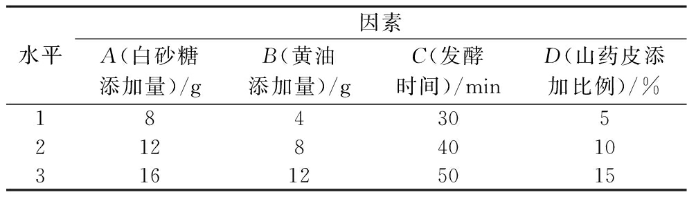水平因素A(白砂糖添加量)/gB(黄油添加量)/gC(发酵时间)/minD(山药皮添加比例)/%18430521284010316125015