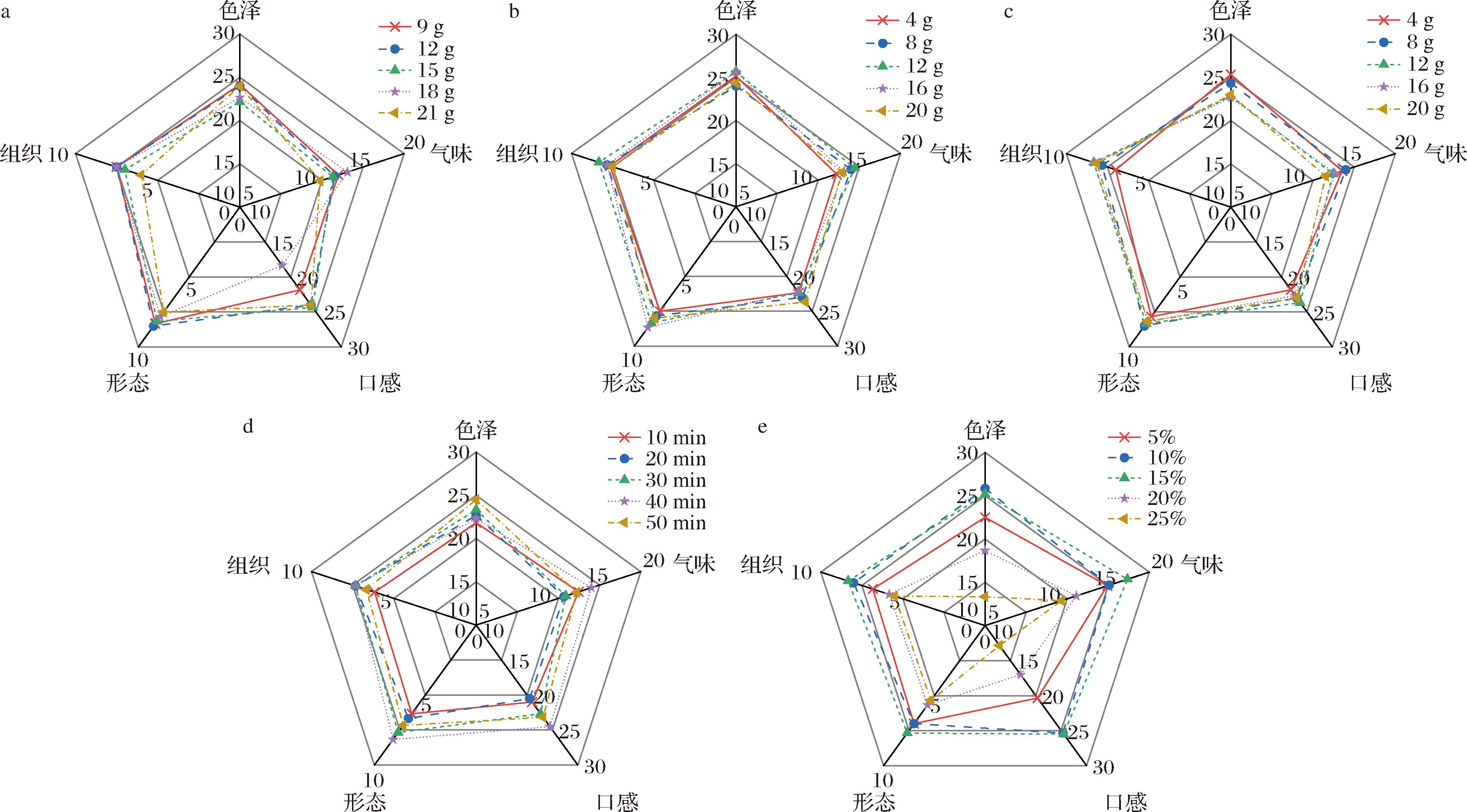 a-牛奶添加量;b-白砂糖添加量;c-黄油添加量;d-发酵时间;e-糯米山药皮添加比例