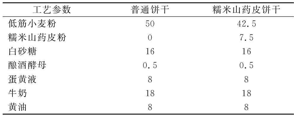根据1.3.2节得出的饼干制备最佳工艺参数,设置不添加糯米山药皮的普通饼干组和添加糯米山药皮的糯米山药皮饼干组进行后续饼干品质特性分析,2组饼干样品的部分工艺参数设置如表4所示,其中发酵时间40 min,其他制备工艺同1.3.1节。