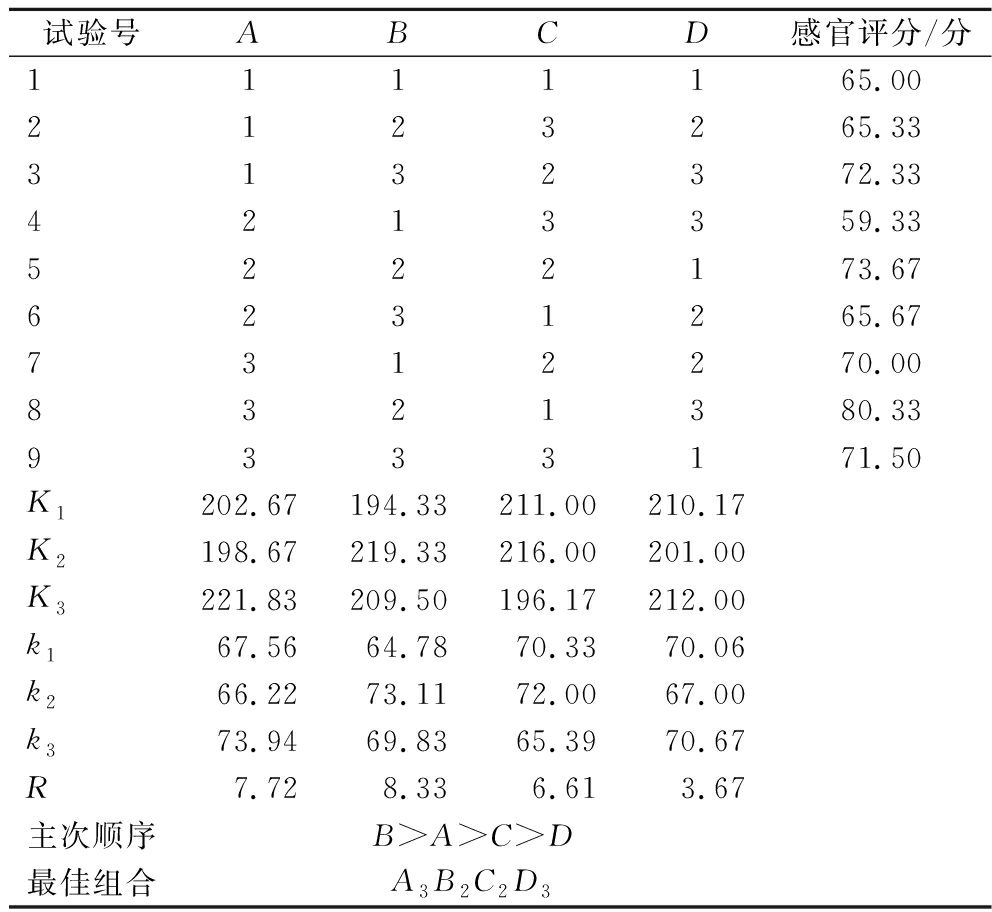 试验号ABCD感官评分/分1111165.002123265.333132372.334213359.335222173.676231265.677312270.008321380.339333171.50K1202.67194.33211.00210.17K2198.67219.33216.00201.00K3221.83209.50196.17212.00k167.5664.7870.3370.06k266.2273.1172.0067.00k373.9469.8365.3970.67R7.728.336.613.67主次顺序B>A>C>D最佳组合A3B2C2D3