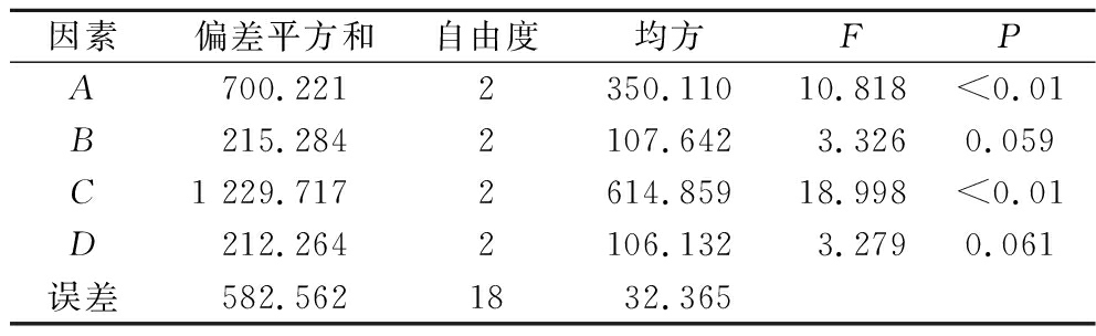 因素偏差平方和自由度均方FPA700.2212350.11010.818<0.01B215.2842107.6423.3260.059C1 229.7172614.85918.998<0.01D212.2642106.1323.2790.061误差582.5621832.365