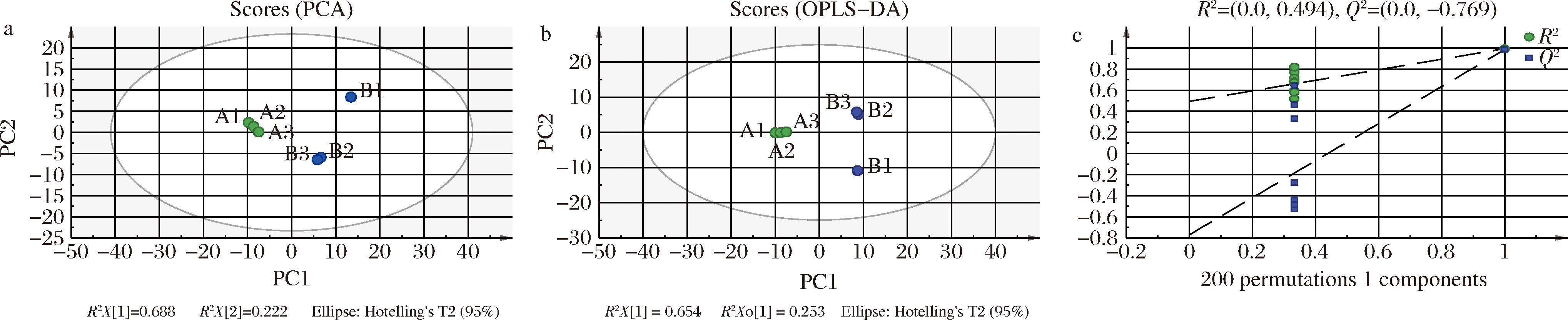 a-PCA图;b-OPLS-DA图;c-置换检验图