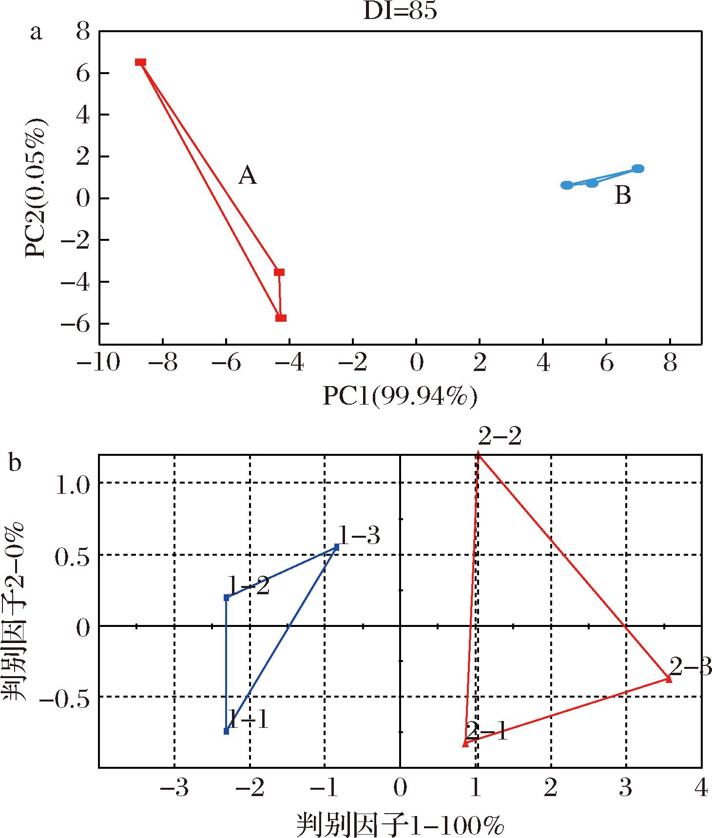 a-PCA图(A:普通饼干;B:糯米山药皮饼干);b-LDA图