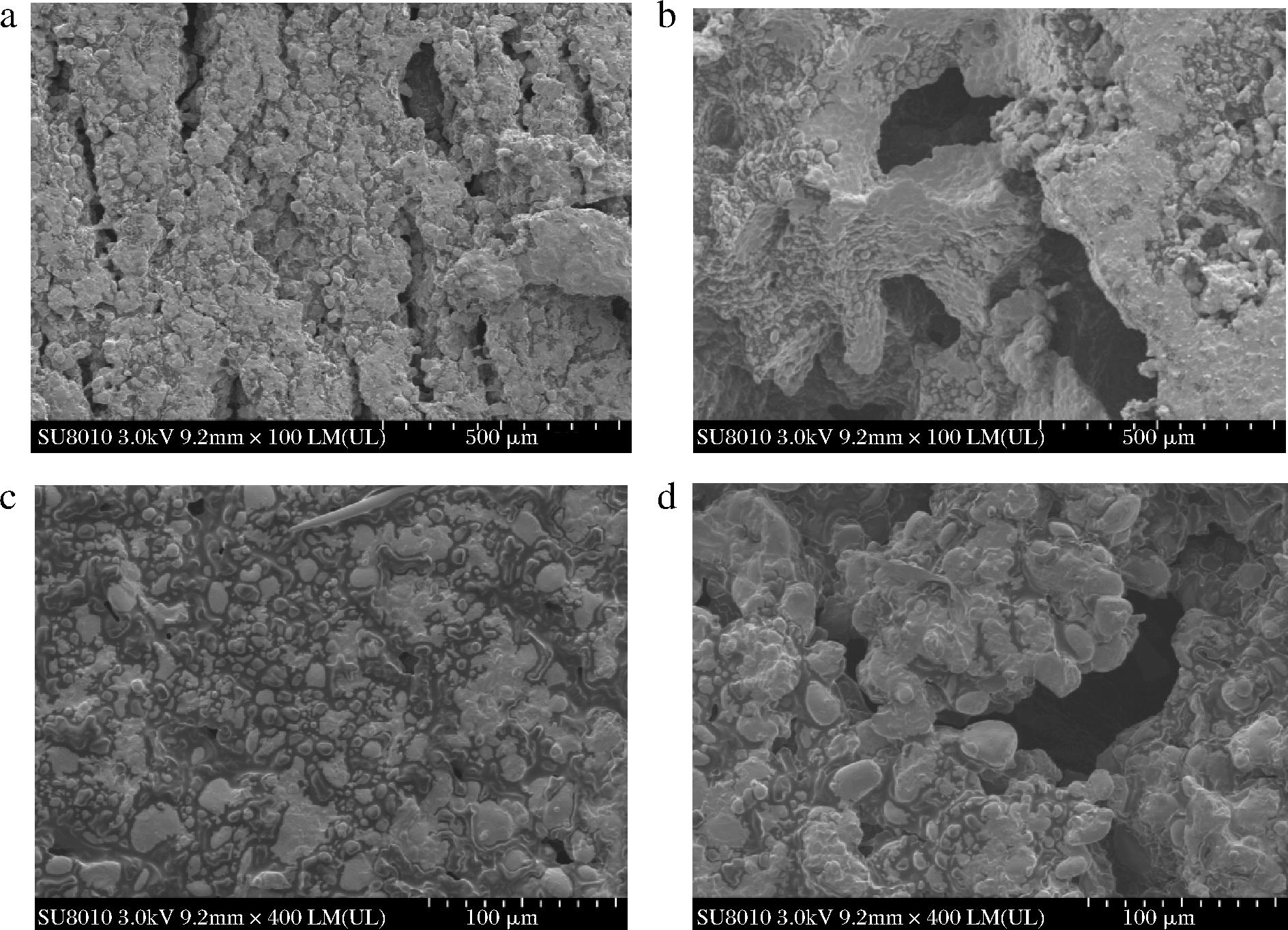 a-普通饼干100×;b-糯米山药皮饼干100×;c-普通饼干400×;d-糯米山药皮饼干400×