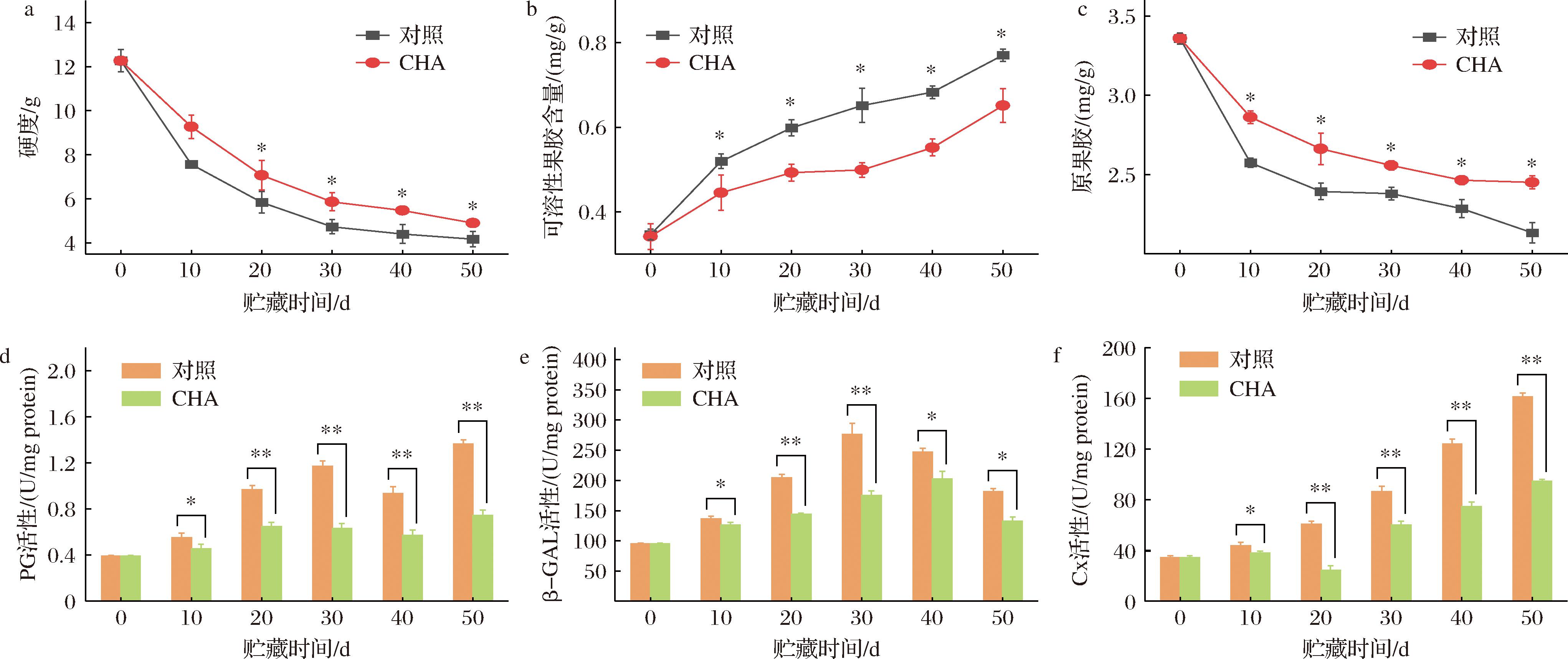 李果实成熟期硬度会自然下降,但软化过快是冷害引发的次生伤害,影响耐贮性。图4-a显示对照组果实硬度在贮藏第30天之前急速下降,与褐变速度最快的时期相对应,说明硬度下降也与发生冷害有关。而CHA处理组果实硬度在贮藏期间始终显著高于对照组(P<0.05),表明处理能够缓解冷害引发的硬度下降。