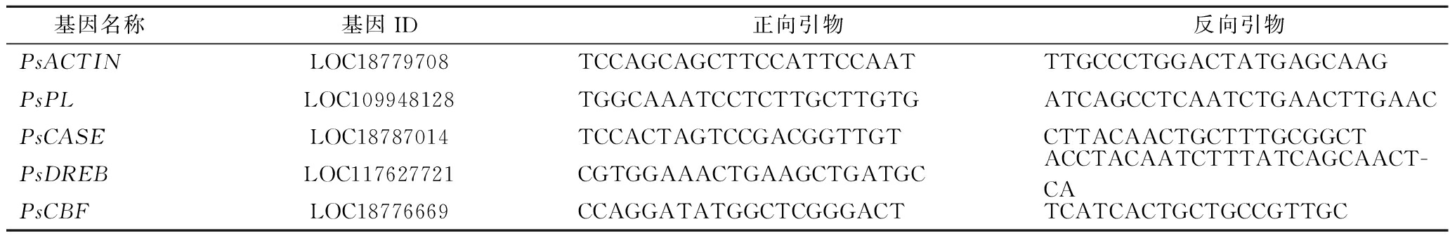 基因名称基因ID正向引物反向引物PsACTINLOC18779708TCCAGCAGCTTCCATTCCAATTTGCCCTGGACTATGAGCAAGPsPLLOC109948128TGGCAAATCCTCTTGCTTGTGATCAGCCTCAATCTGAACTTGAACPsCASELOC18787014TCCACTAGTCCGACGGTTGTCTTACAACTGCTTTGCGGCTPsDREBLOC117627721CGTGGAAACTGAAGCTGATGCACCTACAATCTTTATCAGCAACT-CAPsCBFLOC18776669CCAGGATATGGCTCGGGACTTCATCACTGCTGCCGTTGC