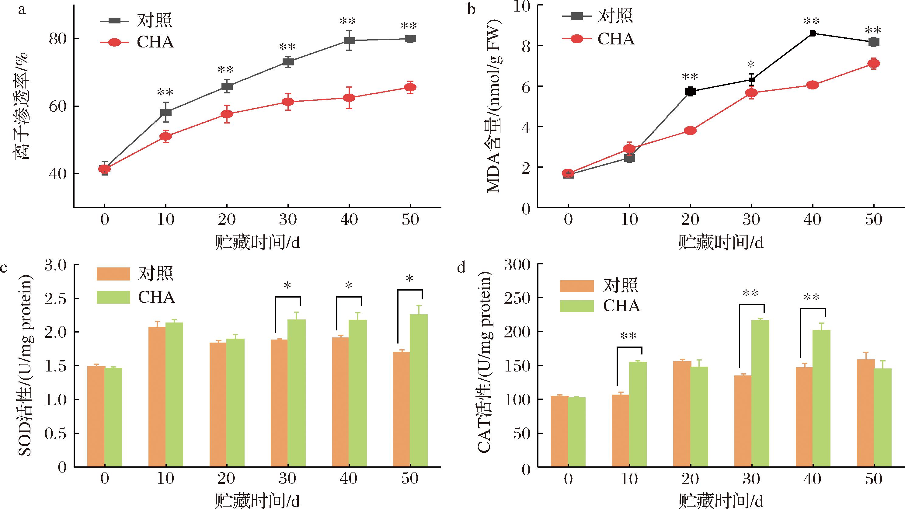 离子渗透率与细胞膜完整性呈负相关。图3-a显示采后离子渗透率呈上升趋势,在不同实验组中离子渗透率上升的速率有较大差异,对照组果实离子渗透率上升迅速,贮藏结束时接近80%,CHA处理组果实李子渗透率在贮藏期间始终显著低于对照组(P<0.01),贮藏结束时上升至65%。CHA处理果实细胞膜完整性更好。MDA积累意味着氧化损伤。图3-b显示贮藏期间果实的MDA不断积累,但CHA处理组MDA含量上升速度小于对照组,贮藏第30天以后MDA含量显著低于对照组(P<0.05或P<0.01),说明低温胁迫加速了李果实的衰老,CHA处理缓解氧化损伤。