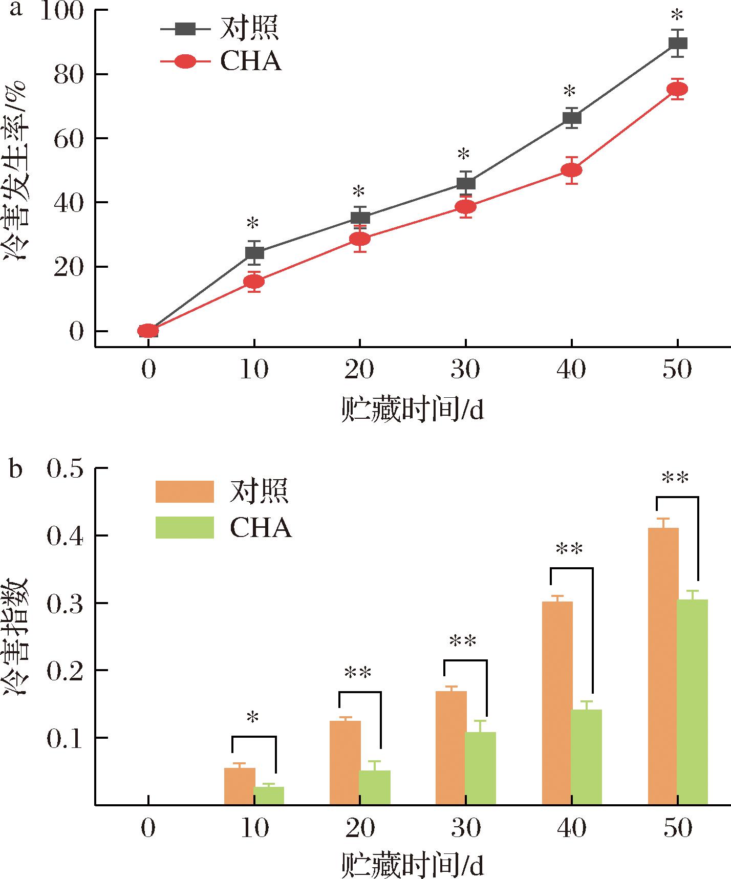 图1 CHA处理对0 ℃贮藏期间李果实冷害发生率和冷害指数的影响