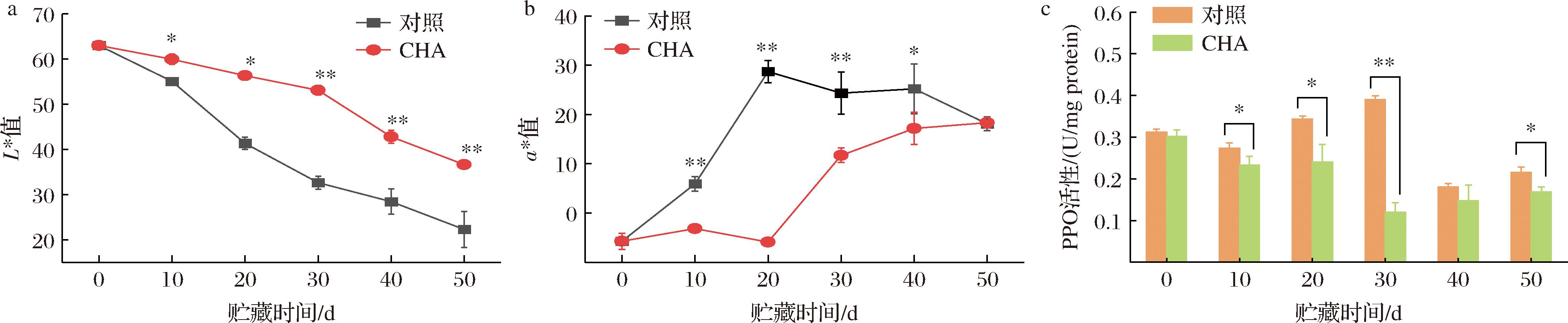 L*值表示果肉亮度,与褐变程度负相关。如图2-a所示,对照组果实L*值在贮藏第20天时低于50,第50天时低于25,有棕褐色物质出现,CHA处理组果实L*值始终显著高于对照组(P<0.05),直到贮藏第30天时仍维持在50以上,没有明显的褐色物质产生。果实于初熟期采摘,少量叶绿素导致a*值初始为负值,随着叶绿素分解,a*值升高。本品种正常成熟时果肉颜色为淡黄色,a*值为正但上升缓慢,对照组a*值上升速度快且数值较高(图2-a),是果肉褐变初期产生的红棕色物质引起,但贮藏第20天后褐变程度过高,有褐色物质生成,a*值又呈现下降趋势,与L*值低于50的时间点相同。CHA处理组a*值贮藏期间始终显著低于对照组(P<0.05或P<0.01),且没有观察到下降的趋势,意味着没有明显的棕褐色出现,褐变程度低于对照组。图2-c结果显示,对照组果实PPO活性在贮藏第20天和第30天时具有明显的高峰,与L*值迅速下降和a*值迅速升高的时间段相对应,而CHA处理组果实PPO活性贮藏期间没有明显的峰值出现,在第10、20、30和50天显著低于对照组(P<0.05或P<0.01)。CHA处理显著抑制PPO活性,并影响褐变进程。
