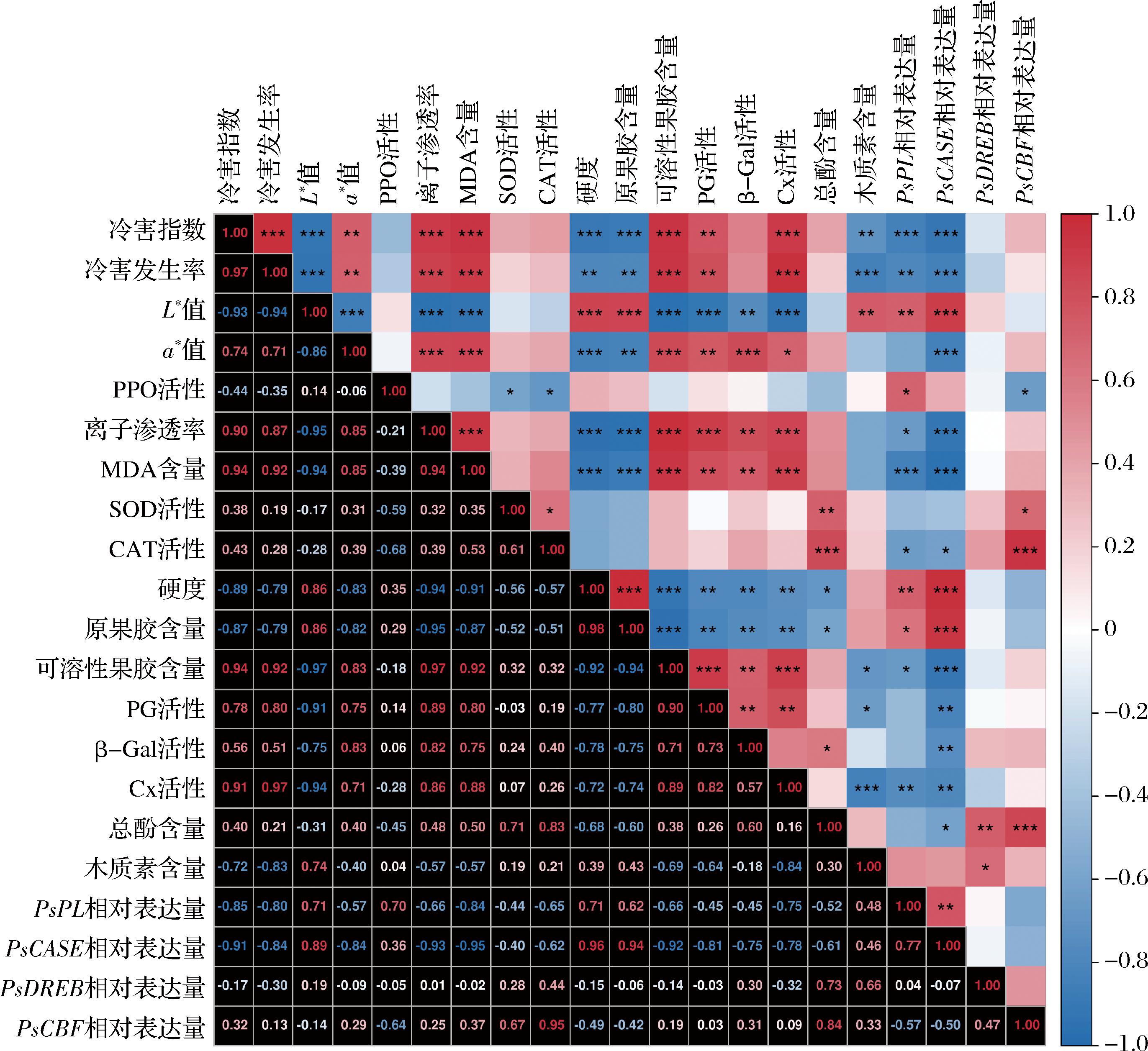 对全部指标进行正态性检验,满足正态性条件,因此进行皮尔逊相关性分析,结果如图6所示:冷害发生率和冷害指数与a*值、离子渗透率、MDA含量、可溶性果胶含量、PG活性、Cx活性呈显著正相关(P<0.01或P<0.001),与L*值、硬度、原果胶含量、木质素含量、PsCASE相对表达量呈显著负相关(P<0.01或P<0.001)。此外,PsCBF表达量与SOD和CAT活性以及总酚含量呈显著正相关(P<0.05或P<0.001),PsDREB表达量与总酚含量和木质素含量呈显著正相关(P<0.05或P<0.01)。意味这些指标之间可能存在一定的相互影响。