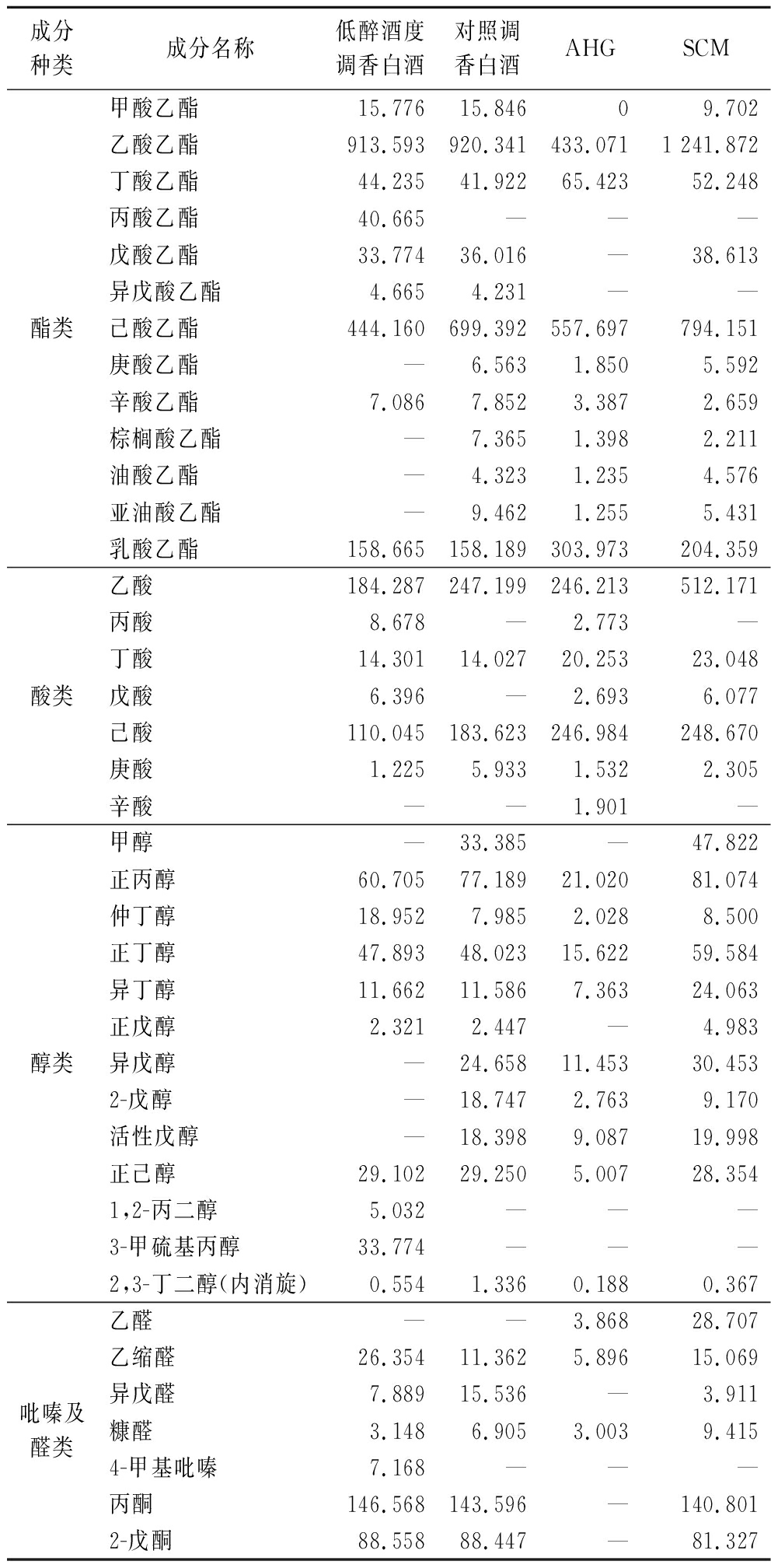 以表1浓香型白酒主要风味成分构成为参考,通过增加对乙醇代谢关键酶有激活作用以及减少或缺失具有抑制作用的风味成分,设计一款乙醇体积分数为42%的低醉酒度调香白酒。以市售固液法浓香型白酒SCM、AHG为对照样品。