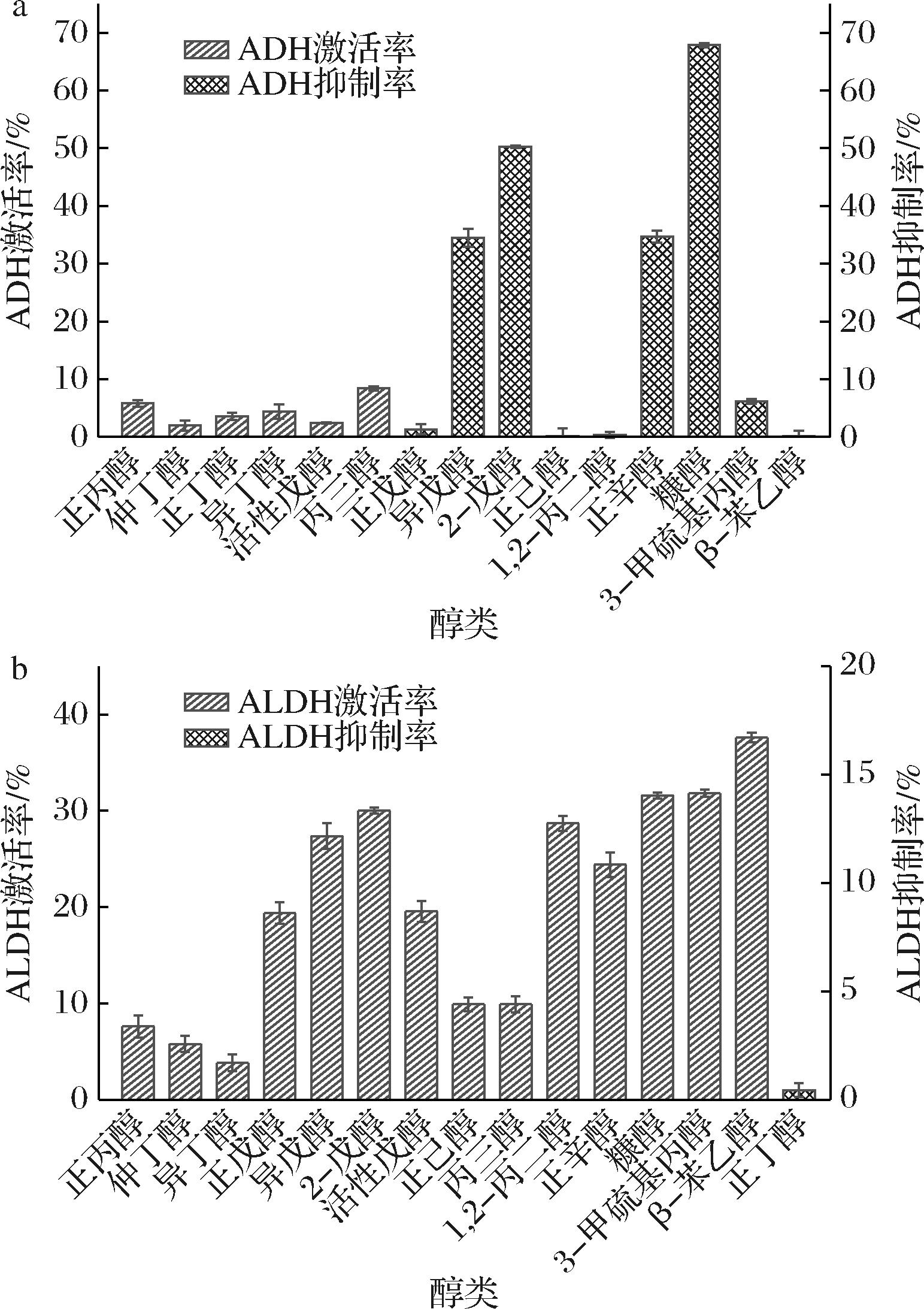 图3 醇类风味成分体外对ADH和ALDH活性的影响