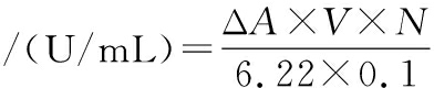 式中:ΔA,每分钟吸光度增加值;V,反应总体积;N,稀释倍数;0.1,酶溶液的体积;6.22,NADH在340 nm处的毫摩尔消光系数。