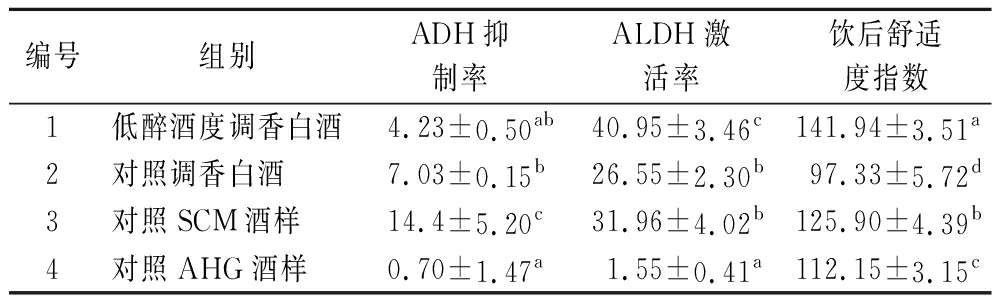 编号组别ADH抑制率ALDH激活率饮后舒适度指数1低醉酒度调香白酒4.23±0.50ab40.95±3.46c141.94±3.51a2对照调香白酒7.03±0.15b26.55±2.30b97.33±5.72d3对照SCM酒样14.4±5.20c31.96±4.02b125.90±4.39b4对照AHG酒样0.70±1.47a1.55±0.41a112.15±3.15c