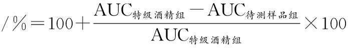 式中:AUC特级酒精组,指饮用特级食用酒精后BAC-t图中乙醇曲线下面积;AUC待测样品组,指饮用待测样品后BAC-t图中乙醇曲线下面积。