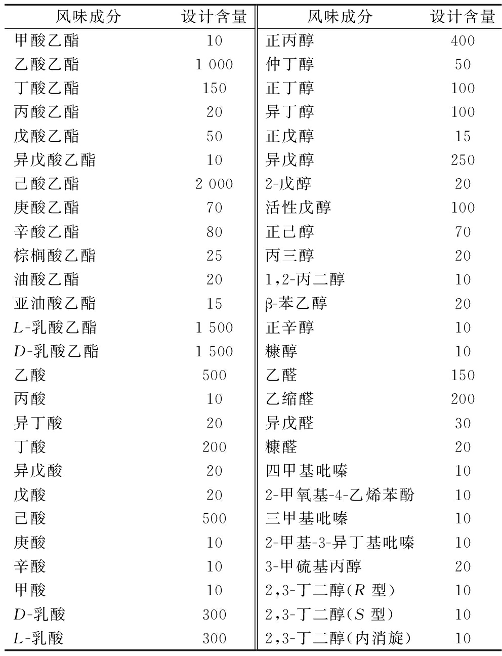 选取浓香型白酒的关键风味成分,具体含量参考李正涛等[11],略作调整,以体积分数为50%的食用酒精配制单体风味成分,结果见表1。