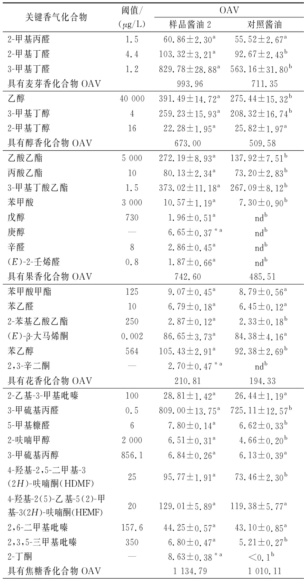 关键香气化合物阈值/(μg/L)OAV样品酱油2对照酱油2-甲基丙醛1.560.86±2.30a55.52±2.67a2-甲基丁醛4.4103.32±3.21a92.67±2.43b3-甲基丁醛1.2829.78±28.88a563.16±31.80b具有麦芽香化合物OAV993.96711.35乙醇40 000391.49±14.72a275.44±15.32b3-甲基丁醇4259.23±15.93a208.32±16.74b2-甲基丁醇1622.28±1.95a25.82±1.97a具有醇香化合物OAV673.00509.58乙酸乙酯5 000272.19±8.93a137.92±7.51b丙酸乙酯1080.13±2.34a73.20±2.83b3-甲基丁酸乙酯1.5373.02±11.18a267.09±8.12b苯甲酸3 00010.57±1.19a7.30±0.90b戊醇7301.96±0.51andb庚醇—6.65±0.37*andb辛醛82.86±0.45andb(E)-2-壬烯醛0.81.87±0.66andb具有果香化合物OAV742.60485.51苯甲酸甲酯1259.07±0.45a8.79±0.56a苯乙醛106.79±0.18a6.45±0.12a2-苯基乙酸乙酯2502.87±0.12a2.33±0.18b(E)-β-大马烯酮0.00286.65±3.73a84.38±4.16a苯乙醇564105.43±2.91a92.38±2.69b2,3-辛二酮—2.70±0.47*andb具有花香化合物OAV210.81194.332-乙基-3-甲基吡嗪10028.81±1.42a26.44±1.19a3-甲硫基丙醛0.5809.00±13.75a725.11±12.57b5-甲基糠醛67.80±0.14a6.62±0.33b2-呋喃甲醇2 0006.51±0.31a4.66±0.20b3-甲硫基丙醇856.16.84±0.26a6.13±0.39a4-羟基-2,5-二甲基-3(2H)-呋喃酮(HDMF)2595.77±1.91a73.46±2.30b4-羟基-2(5)-乙基-5(2)-甲基-3(2H)-呋喃酮(HEMF)20129.01±5.89a119.38±5.77a2,6-二甲基吡嗪157.644.25±0.57a43.10±0.85a2,3,5-三甲基吡嗪3506.80±0.47a5.21±0.27b2-丁酮—8.63±0.38*a<0.1b具有焦糖香化合物OAV1 134.791 010.11