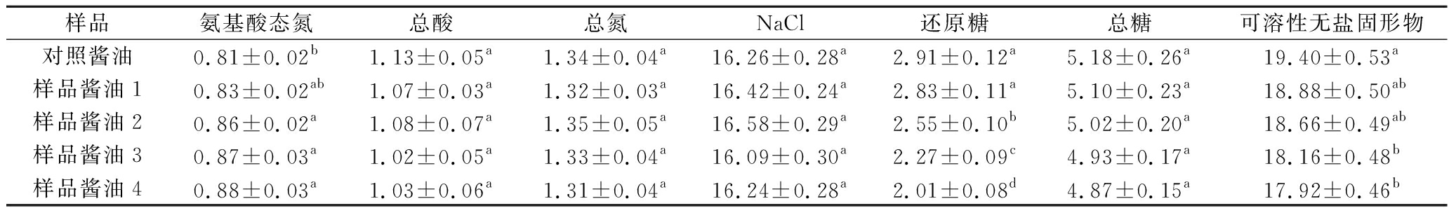 表2 五种酱油理化指标的比较 单位:g/100 mL