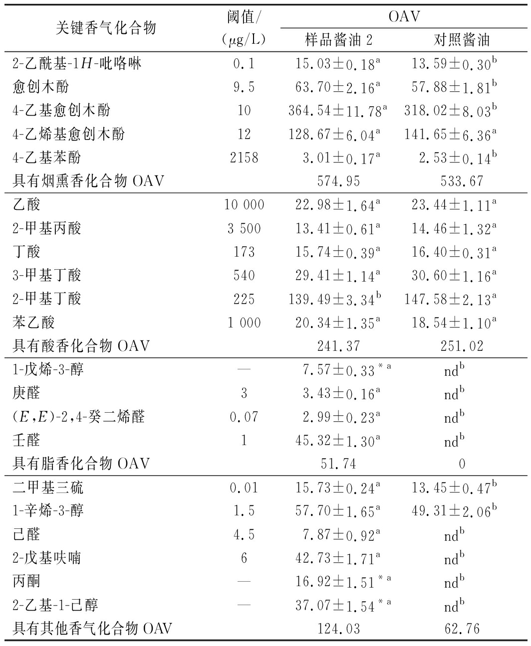 关键香气化合物阈值/(μg/L)OAV样品酱油2对照酱油2-乙酰基-1H-吡咯啉0.115.03±0.18a13.59±0.30b愈创木酚9.563.70±2.16a57.88±1.81b4-乙基愈创木酚10364.54±11.78a318.02±8.03b4-乙烯基愈创木酚12128.67±6.04a141.65±6.36a4-乙基苯酚21583.01±0.17a2.53±0.14b具有烟熏香化合物OAV574.95533.67乙酸10 00022.98±1.64a23.44±1.11a2-甲基丙酸3 50013.41±0.61a14.46±1.32a丁酸17315.74±0.39a16.40±0.31a3-甲基丁酸54029.41±1.14a30.60±1.16a2-甲基丁酸225139.49±3.34b147.58±2.13a苯乙酸1 00020.34±1.35a18.54±1.10a具有酸香化合物OAV241.37251.021-戊烯-3-醇—7.57±0.33*andb庚醛33.43±0.16andb(E,E)-2,4-癸二烯醛0.072.99±0.23andb壬醛145.32±1.30andb具有脂香化合物OAV51.740二甲基三硫0.0115.73±0.24a13.45±0.47b1-辛烯-3-醇1.557.70±1.65a49.31±2.06b己醛4.57.87±0.92andb2-戊基呋喃642.73±1.71andb丙酮—16.92±1.51*andb2-乙基-1-己醇—37.07±1.54*andb具有其他香气化合物OAV124.0362.76