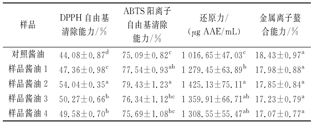 样品DPPH自由基清除能力/%ABTS阳离子自由基清除能力/%还原力/(μg AAE/mL)金属离子螯合能力/%对照酱油44.08±0.87d75.09±0.82c1 016.65±47.03c18.43±0.97a样品酱油147.36±0.98c77.54±0.93ab1 279.45±63.89b17.98±0.88a样品酱油254.04±0.35a79.43±1.23a1 425.13±75.11a17.85±0.84a样品酱油350.27±0.66b76.34±1.12bc1 359.91±66.71ab17.23±0.79a样品酱油449.58±0.70b75.69±1.08bc1 308.55±55.47ab17.07±0.77a