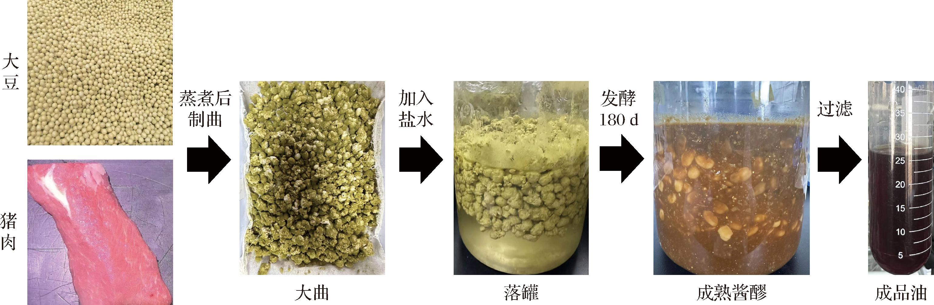 大豆洗净后常温浸泡10 h,沥干水分,猪肉洗净,绞肉机绞碎至4 mm×4 mm×4 mm大小颗粒,然后将大豆和猪肉放于高压灭菌锅中,121 ℃蒸煮20 min,随后静置降温至40 ℃以下,按照表1的比例拌曲,加入已拌好曲精(米曲霉)的面粉,然后放入铺好无菌纱布的筐里,在30 ℃恒温培养箱中培养44 h。0~8 h培养条件为30 ℃、湿度95%,8~36 h培养条件为28 ℃、湿度95%,36~40 h培养条件保持为28 ℃、湿度85%,40~44 h培养条件为28 ℃、湿度65%。并于培养第16 h进行第一次翻曲,第24 h进行第二次翻曲,培养至混合物被浅绿及深绿的米曲霉孢子覆盖时结束制曲。之后按照质量比1∶2.5的比例将成曲与220 g/L的盐水混匀,日晒夜露180 d。对照酱油为普通大豆酱油(22%盐水、盐水∶大曲=1∶2.5),样品酱油为使用猪肉代替不同比例大豆的酱油。主要原料具体使用比例见表1,生产过程见图1。