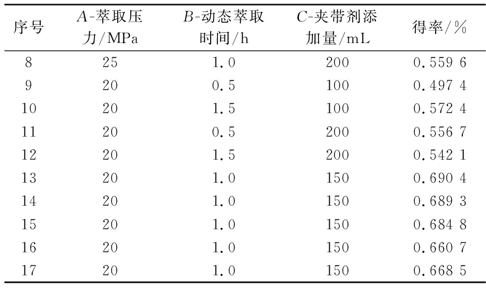 序号A-萃取压力/MPaB-动态萃取时间/hC-夹带剂添加量/mL得率/%8251.02000.559 69200.51000.497 410201.51000.572 411200.52000.556 712201.52000.542 113201.01500.690 414201.01500.689 315201.01500.684 816201.01500.660 717201.01500.668 5
