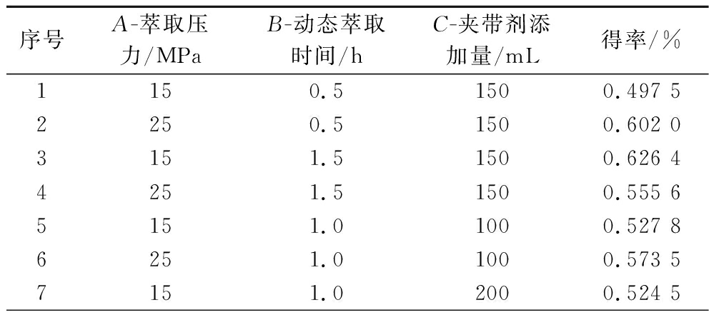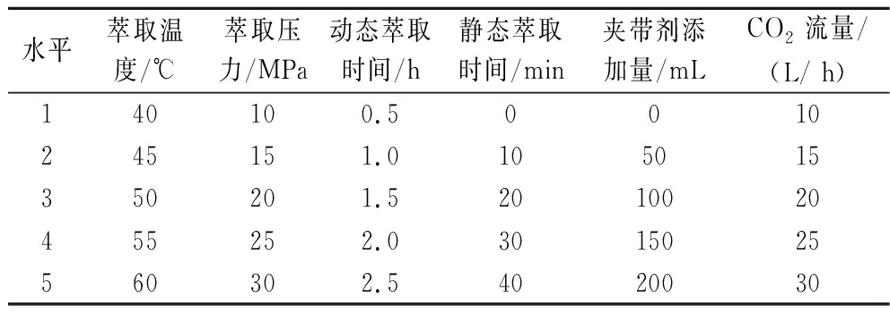 水平萃取温度/℃萃取压力/MPa动态萃取时间/h静态萃取时间/min夹带剂添加量/mLCO2流量/(L/ h)140100.50010245151.0105015350201.52010020455252.03015025560302.54020030