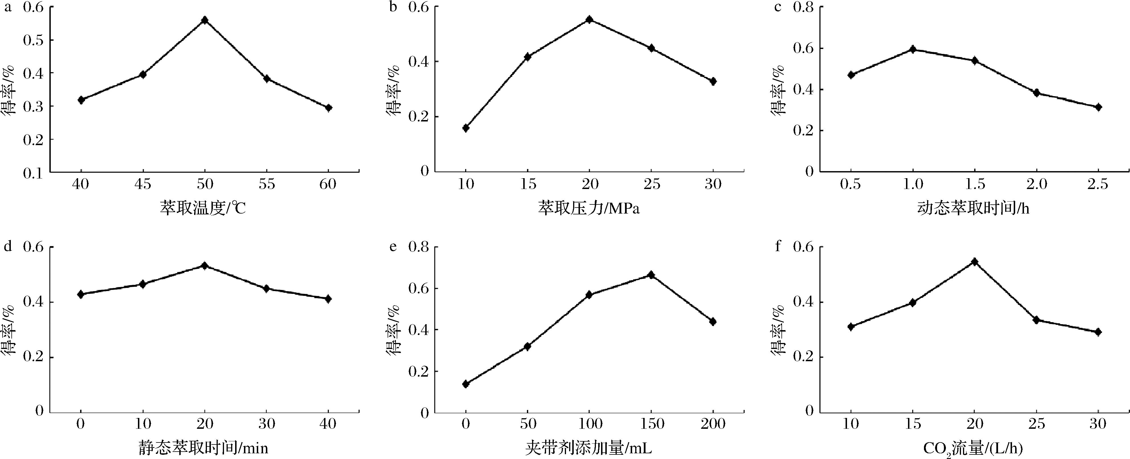 a-萃取温度;b-萃取压力;c-动态萃取时间;d-静态萃取时间;e-夹带剂添加量;f-CO2流量