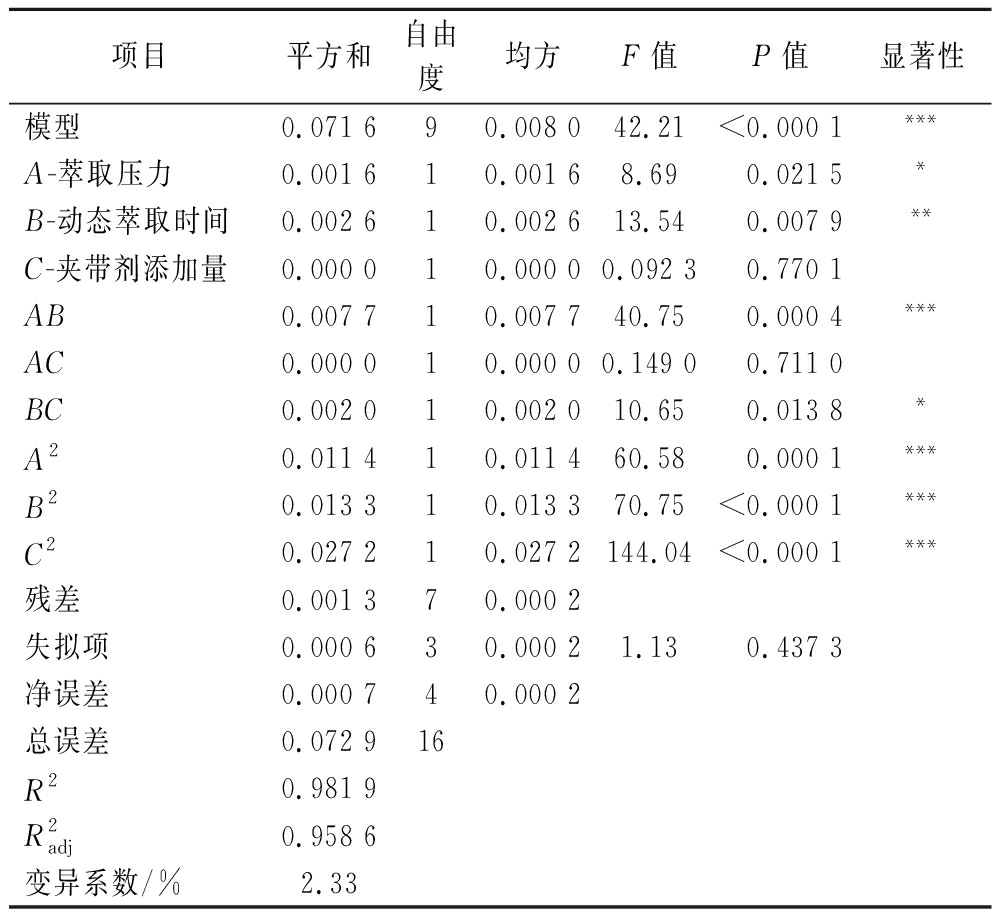 项目平方和 自由度均方F值P值显著性模型0.071 690.008 042.21<0.000 1***A-萃取压力0.001 610.001 68.690.021 5*B-动态萃取时间0.002 610.002 613.540.007 9**C-夹带剂添加量0.000 010.000 00.092 30.770 1AB0.007 710.007 740.750.000 4***AC0.000 010.000 00.149 00.711 0BC0.002 010.002 010.650.013 8*A20.011 410.011 460.580.000 1***B20.013 310.013 370.75<0.000 1***C20.027 210.027 2144.04<0.000 1***残差0.001 370.000 2失拟项0.000 630.000 21.130.437 3净误差0.000 740.000 2总误差0.072 916R20.981 9R2adj0.958 6变异系数/%2.33