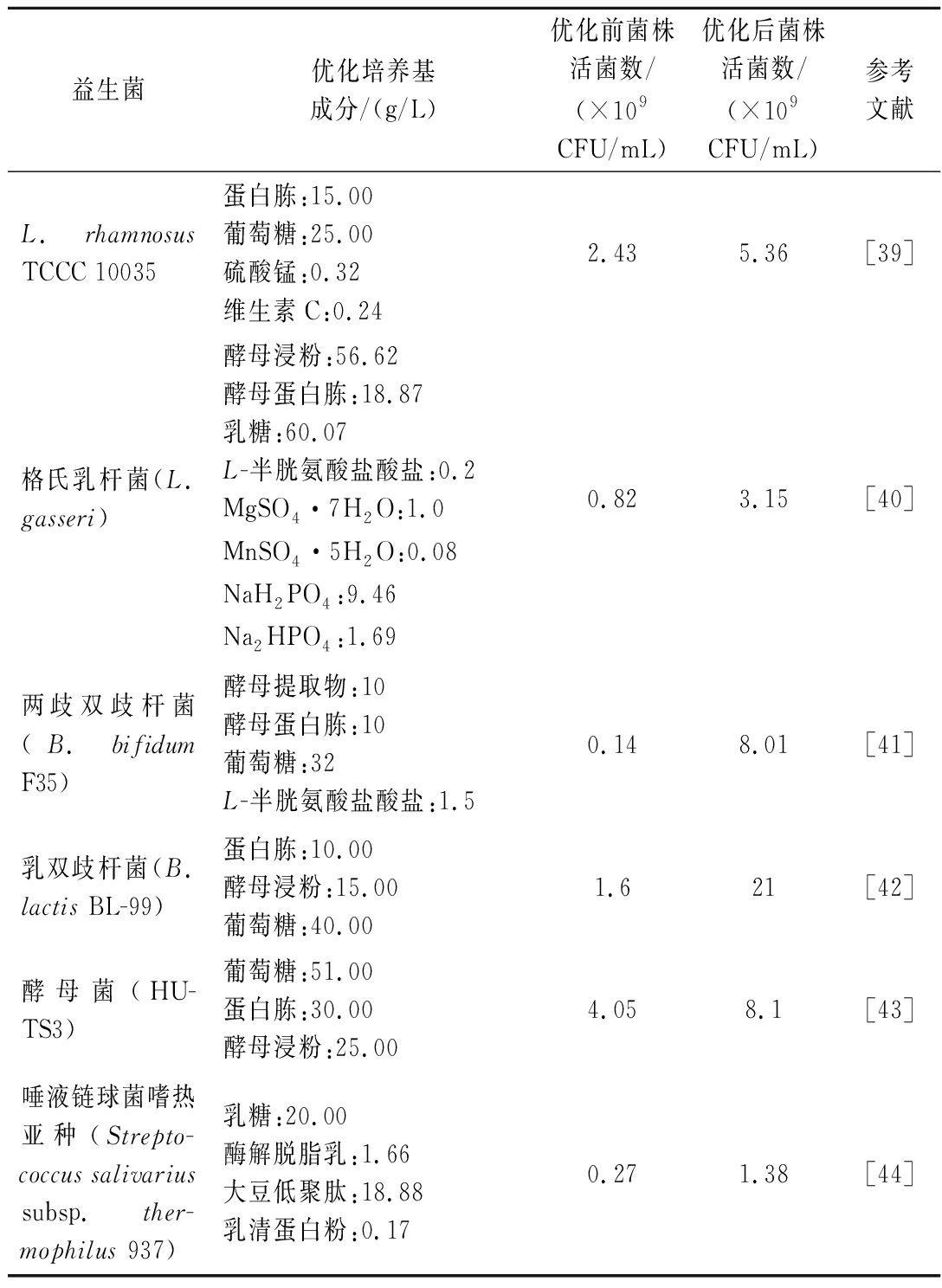 益生菌优化培养基成分/(g/L)优化前菌株活菌数/(×109CFU/mL)优化后菌株活菌数/(×109CFU/mL)参考文献L.rhamnosus TCCC 10035蛋白胨:15.00葡萄糖:25.00硫酸锰:0.32维生素C:0.242.435.36[39]格氏乳杆菌(L.gasseri)酵母浸粉:56.62酵母蛋白胨:18.87乳糖:60.07L-半胱氨酸盐酸盐:0.2MgSO4·7H2O:1.0MnSO4·5H2O:0.08NaH2PO4:9.46Na2HPO4:1.690.823.15[40]两歧双歧杆菌(B.bifidum F35)酵母提取物:10酵母蛋白胨:10葡萄糖:32L-半胱氨酸盐酸盐:1.50.148.01[41]乳双歧杆菌(B.lactis BL-99)蛋白胨:10.00酵母浸粉:15.00葡萄糖:40.001.621[42]酵母菌(HU-TS3)葡萄糖:51.00蛋白胨:30.00酵母浸粉:25.004.058.1[43]唾液链球菌嗜热亚种(Strepto-coccus salivarius subsp.ther-mophilus 937)乳糖:20.00酶解脱脂乳:1.66大豆低聚肽:18.88乳清蛋白粉:0.170.271.38[44]