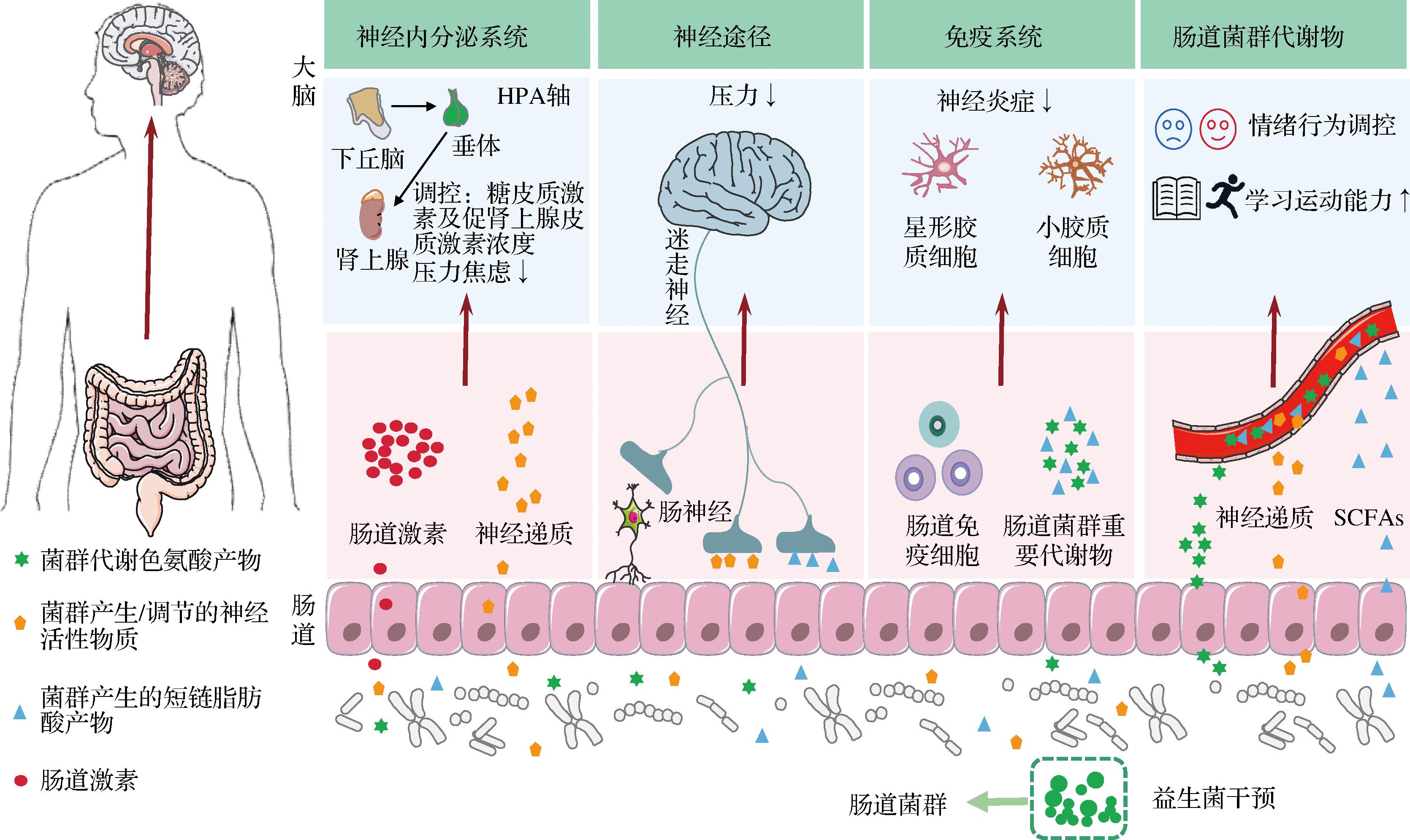 肠道菌群产生的重要代谢物SCFAs以及5-羟色胺(5-hydroxytryptamine,5-HT)、γ-氨基丁酸(gamma-aminobutyric acid,GABA)和多巴胺等神经递质可通过体液或神经等途径作用于大脑,调控宿主情绪与行为。摄入益生菌可以调控肠道菌群代谢物,影响大脑健康,如可通过促进肠道有益微生物增殖及代谢复杂碳水化合物等途径增加SCFAs含量,影响MGBA和脑功能[6];益生菌还可以调节宿主体内神经递质含量,如摄入植物乳植杆菌(Lactiplantibacillus plantarum)DR7可参与调节GABA、多巴胺、5-HT等重要神经递质,改善患者学习和运动能力的同时,也参与调节情绪、认知及睡眠[5]。