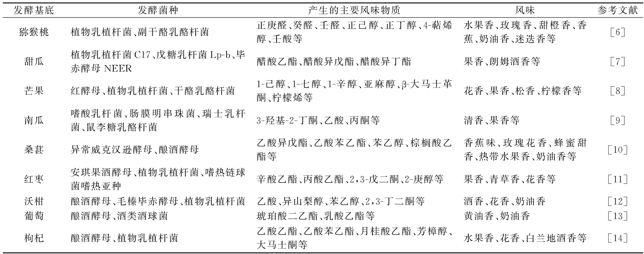发酵基底发酵菌种产生的主要风味物质风味参考文献猕猴桃植物乳植杆菌、副干酪乳酪杆菌正庚醛、癸醛、壬醛、正己醇、正丁醇、4-萜烯醇、壬酸等水果香、玫瑰香、甜橙香、香蕉、奶油香、迷迭香等[6]甜瓜植物乳植杆菌C17、戊糖乳杆菌Lp-b、毕赤酵母NEER醋酸乙酯、醋酸异戊酯、醋酸异丁酯果香、朗姆酒香等[7]芒果红酵母、植物乳植杆菌、干酪乳酪杆菌1-己醇、1-七醇、1-辛醇、亚麻醇、β-大马士革酮、柠檬烯等花香、果香、松香、柠檬香等[8]南瓜嗜酸乳杆菌、肠膜明串珠菌、瑞士乳杆菌、鼠李糖乳酪杆菌3-羟基-2-丁酮、乙酸、丙酮等清香、果香等[9]桑葚异常威克汉逊酵母、酿酒酵母乙酸异戊酯、乙酸苯乙酯、苯乙醇、棕榈酸乙酯等香蕉味、玫瑰花香、蜂蜜甜香、热带水果香、奶油香等[10]红枣安琪果酒酵母、植物乳植杆菌、嗜热链球菌嗜热亚种辛酸乙酯、丙酸乙酯、2,3-戊二酮、2-庚醇等果香、青草香、花香等[11]沃柑酿酒酵母、毛榛毕赤酵母、植物乳植杆菌乙酸、异山梨醇、苯乙醇、2,3-丁二酮等酒香、花香、奶油香[12]葡萄酿酒酵母、酒类酒球菌琥珀酸二乙酯、乳酸乙酯等黄油香、奶油香[13]枸杞酿酒酵母、植物乳植杆菌乙酸乙酯、乙酸苯乙酯、月桂酸乙酯、芳樟醇、大马士酮等水果香、花香、白兰地酒香等[14]