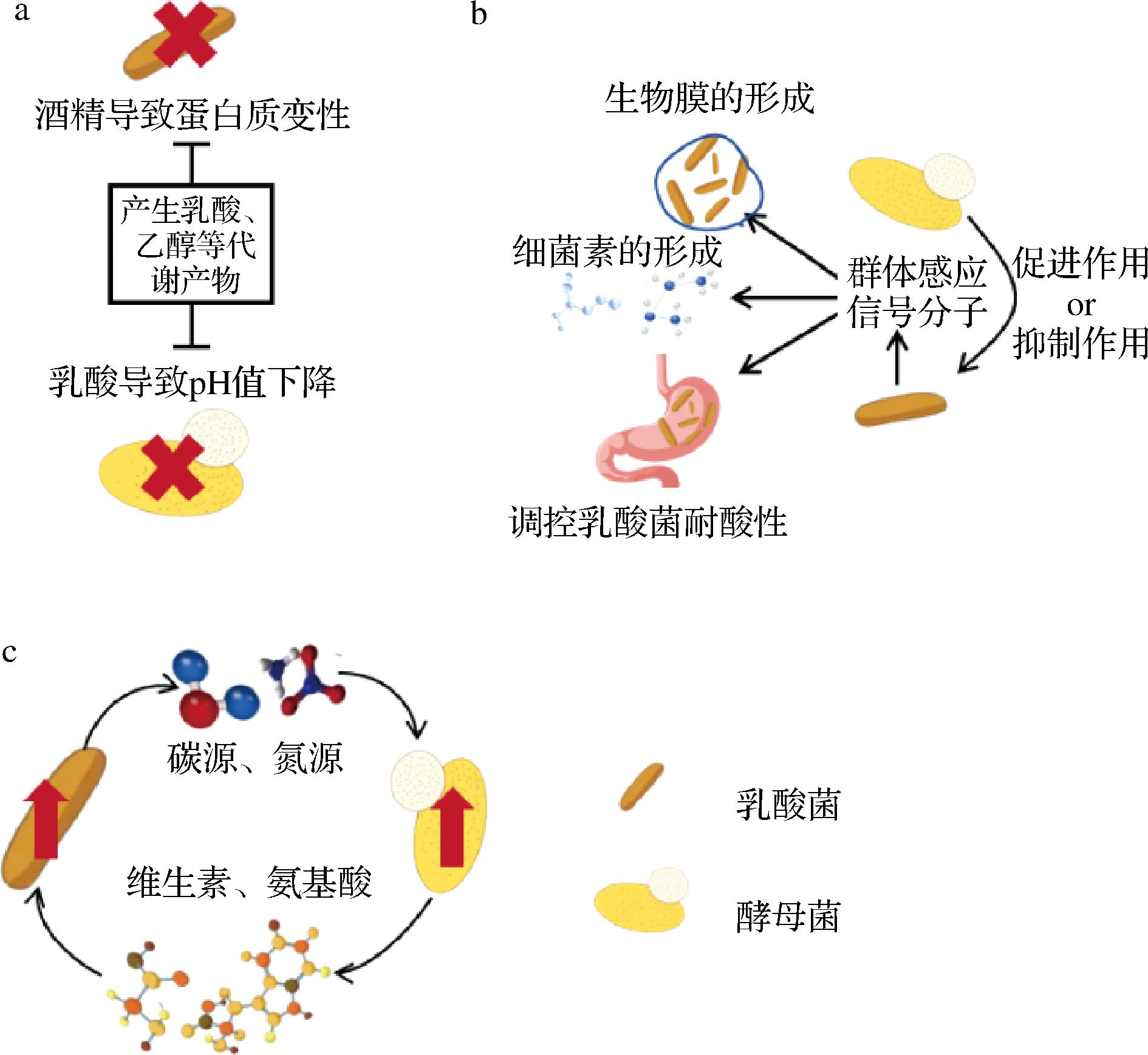 图1 乳酸菌和酵母菌的主要相互作用机制