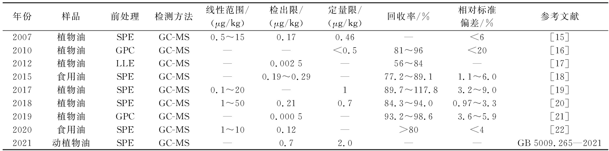 年份样品前处理检测方法线性范围/(μg/kg)检出限/(μg/kg)定量限/(μg/kg)回收率/%相对标准偏差/%参考文献2007植物油SPEGC-MS0.5~15 0.17 0.46 —<6[15]2010植物油GPCGC-MS——<0.5 81~96<20[16]2012植物油LLEGC-MS—0.002 5—56~84—[17]2015食用油SPEGC-MS—0.19~0.29 —77.2~89.11.1~6.0[18]2017植物油SPEGC-MS0.1~20 —1 89.7~117.83.2~9.0[19]2018植物油SPEGC-MS 1~50 0.21 0.7 84.3~94.00.97~3.3 [20]2019植物油GPCGC-MS—0.000 5—93.2~98.63.6~5.9[21]2020食用油SPEGC-MS 1~10 0.12 —>80<4[22]2021动植物油SPEGC-MS—0.7 2.0 ——GB 5009.265—2021