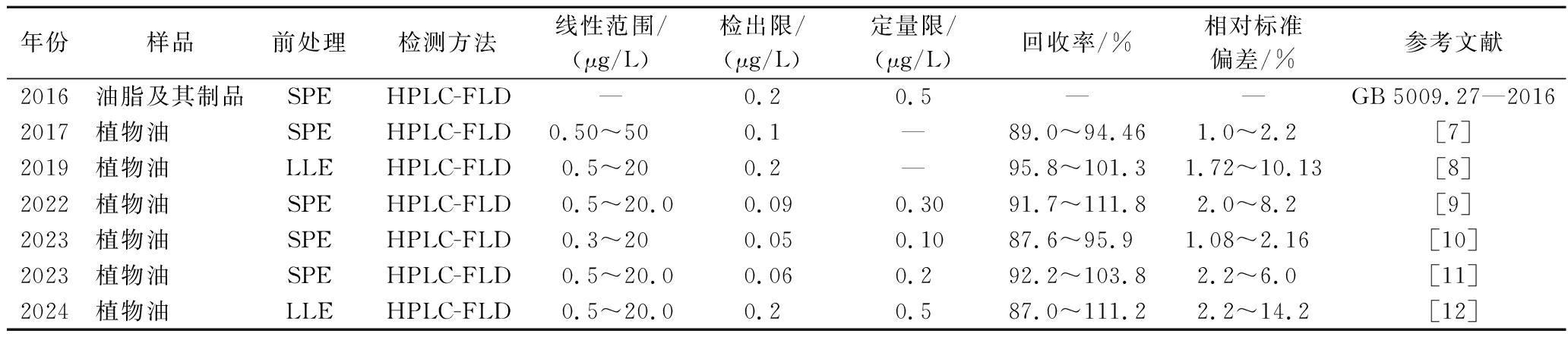 年份样品前处理检测方法线性范围/(μg/L)检出限/(μg/L)定量限/(μg/L)回收率/%相对标准偏差/%参考文献2016油脂及其制品SPEHPLC-FLD—0.2 0.5 ——GB 5009.27—20162017植物油SPEHPLC-FLD0.50~50 0.1 —89.0~94.461.0~2.2[7]2019植物油LLEHPLC-FLD0.5~20 0.2 —95.8~101.31.72~10.13[8]2022植物油SPEHPLC-FLD0.5~20.0 0.09 0.30 91.7~111.82.0~8.2[9]2023植物油SPEHPLC-FLD0.3~20 0.05 0.10 87.6~95.91.08~2.16[10]2023植物油SPEHPLC-FLD0.5~20.0 0.06 0.2 92.2~103.82.2~6.0[11]2024植物油LLEHPLC-FLD0.5~20.0 0.2 0.5 87.0~111.22.2~14.2[12]