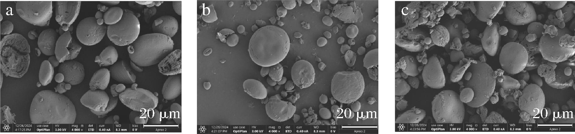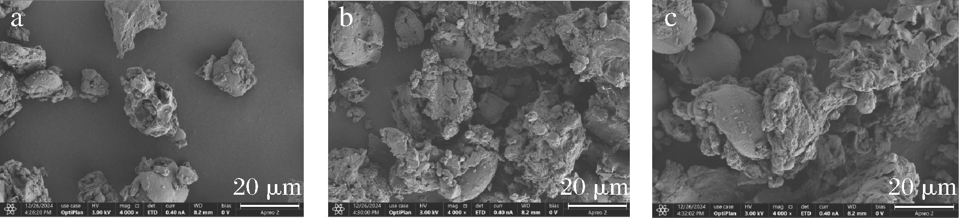如图6所示,样品A、B和C的淀粉颗粒微观形态差异较小。传统高温大曲中的淀粉颗粒呈现规则的多边形结构,表面光滑且存在一定聚集现象(图6-a)。添加甜酒糟或甜酒曲后,淀粉颗粒的形态未发生显著变化(图6-b、图6-c),仅观察到颗粒表面轻微粗糙化,但整体结构仍保持相对完整。这主要由于高温大曲当中的水分活度较低,绝大多数微生物不进行代谢活动,所以加入甜酒糟及甜酒曲,淀粉微观形态均未发生明显变化。