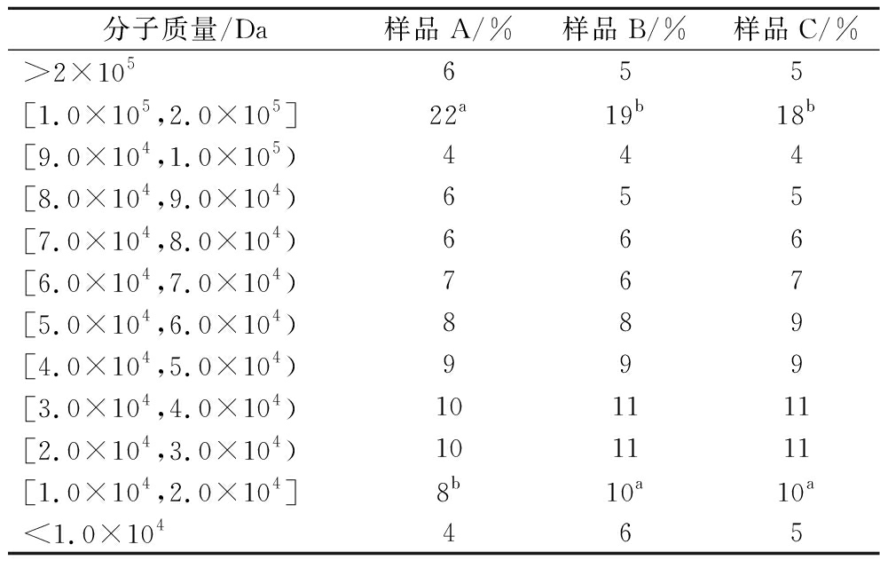 分子质量/Da样品A/%样品B/%样品C/%>2×1056a4b4b[1.0×105,2.0×105]201918[9.0×104,1.0×105)444[8.0×104,9.0×104)555[7.0×104,8.0×104)667[6.0×104,7.0×104)777[5.0×104,6.0×104)888[4.0×104,5.0×104)9910[3.0×104,4.0×104)101111[2.0×104,3.0×104)111111[1.0×104,2.0×104]9b11a10<1.0×104555