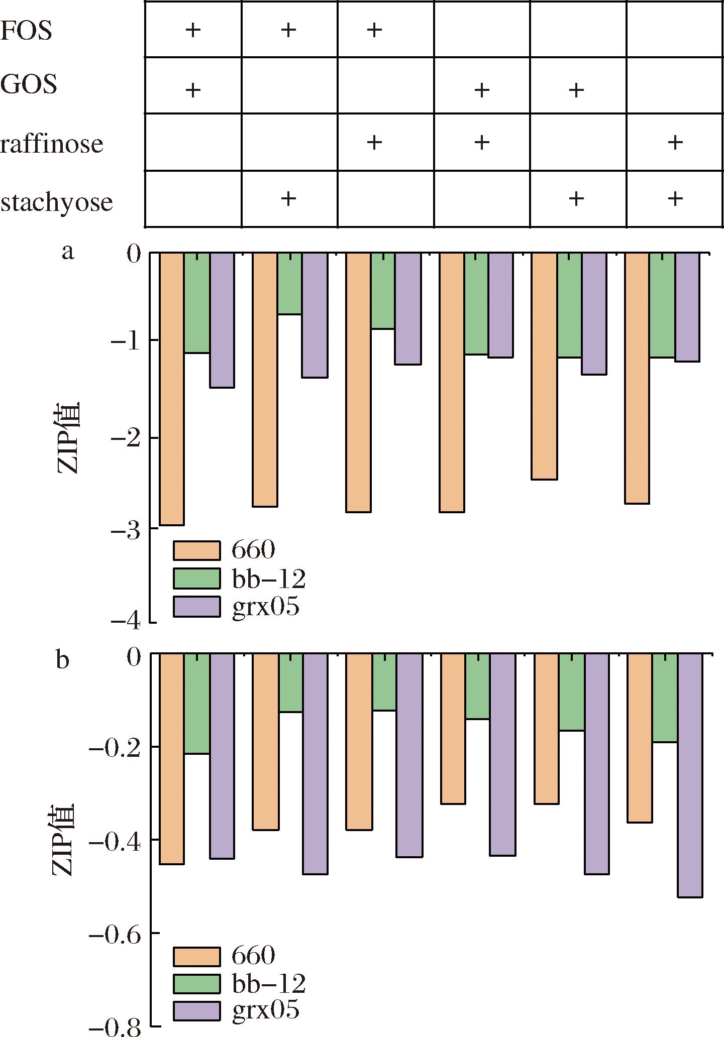 分别选取每一株菌在54种低聚糖组合培养基中生长的最大ΔOD600值和最大比生长率,利用SynergyFinder 3.0分析其组合效应。协同效应评分采用零相互作用效价ZIP模型[14]。若结果的Z>10,则表明分析的2种低聚糖之间存在协同效应;-10 所有实验重复3次。采用SPSS软件对试验数据进行统计分析。检验结果以“平均值±标准差”表示。Origin 2018用于绘图。P<0.05为差异有统计学意义。 如图1所示,在一定范围内随着低聚糖浓度的增加,菌株最大ΔOD600也在逐渐增大。当低聚糖浓度过高时,会抑制菌株的生长,OD600趋于平缓甚至下降。每株菌达到最大ΔOD600和最大比生长率对应的低聚糖组合不同,表现出了特定的低聚糖组合偏好性。 A-B.breve grx05;B-B.animals bb-12;C-L.plantarum 660 图1 菌株在不同低聚糖组合培养基中的生长曲线 如图2所示,B.breve grx05 在54种低聚糖组合培养基中的最大ΔOD600值为0.80,其次为0.79和0.78,最大比生长率为0.34,其次为0.31和0.28。B.animals bb-12 在54种低聚糖组合培养基中的最大ΔOD600值为0.81,其次为0.69和0.67,最大比生长率为0.34,其次为0.25和0.27。L.plantarum 660 在54种低聚糖组合培养基中的最大ΔOD600值为1.76,其次为1.73和1.67,最大比生长率为0.38,其次为0.32和0.30。 A-最大细胞生长量(ΔOD600);B-最大比生长速率 图2 菌株在不同低聚糖组合培养基中的生长情况 不同低聚糖组合促进菌株生长的能力不同。低聚糖作为菌株生长的底物,不仅影响菌株生长的最大OD600值也会影响菌株的生长速率。益生菌在低聚糖组合中的生长速率将影响它们在结肠中与其他肠道微生物的竞争能力。 分别以最大细胞生长量和最大比生长率为指标,基于SynergyFinder 3.0探究54组低聚糖组合对3株菌生长的组合效应。结果如图3所示,本实验条件下所有低聚糖组合的ZIP值都在10以下(-0.125~-2.945)。这表明在本实验的条件下,2种寡糖之间均不存在协同作用,而是存在叠加效应(-10 a-最大细胞生长量(ΔOD600);b-最大比生长率 图3 基于SynergyFinder 3.0的低聚糖组合促进菌株生长的组合效应分析 本结果与FAYED等[21]的报道不同,其采用Chou-Talalay方法分析壳寡糖-FOS、壳寡糖-乳果糖、壳寡糖-菊粉组合对B.animals bb-12生长的促进作用,发现多数都属于协同作用。而本研究采用的是零相互作用效力(zero interaction potency,ZIP)模型[14]。协同性分析模型的差异,可能是导致结果差异的原因。其次,FAYED等[21]采用的低聚糖组合中都含有壳寡糖,壳寡糖是自然界中唯一带正电荷阳离子碱性氨基低聚糖,不同低聚糖对菌株生长的影响不同,可能是导致结果差异的另一个原因[22-23]。 需要注意的是,有研究表明低聚糖与益生菌组合对促进体内营养物质的消化吸收、调节体内免疫应答等表现出潜在的协同效应[24-25]。另有研究指出,基于基因组尺度的代谢网络模型预测益生菌与低聚糖的最佳组合以及益生菌代谢之间的相互作用,以此构建协同性合生元,有助于降低随机试错实验,提高成功效率[26-27]。未来结合代谢网络预测模型,继续在体内探究益生菌-低聚糖组合的协同效应,对协同性合生元的理性设计和产品开发十分必要。 益生菌在不同低聚糖组合的生长具有菌株特异性。选择菌株生长量较高的前3种低聚糖组合,并比较对应的比生长速率,确定最有利于菌株生长的低聚糖组合。结果如表2所示,L.plantarum 660在前3种低聚糖组合中生长的ΔOD600值分别为1.758、1.729、1.672,无显著性差异。但是在FOS2.5+GOS5组合中的比生长速率最大,为本实验条件下最有利于L.plantarum 660生长的低聚糖组合。最有利于B.animals bb-12、B.breve grx05生长的低聚糖组合分别为GOS10+STA10、FOS10+GOS10。 表2 不同低聚糖组合培养基中菌株生长的最大生物量和最大比生长率 菌种低聚糖组合最大细胞产量(ΔOD600)最大比生长速率/h660FOS2.5+STA51.758a0.21bFOS2.5+GOS51.729a0.23aFOS5+RAF51.672a0.21bbb-12FOS2.5+GOS100.810a0.27bRAF10+STA100.686b0.25aGOS10+STA100.673b0.34agrx05FOS10+GOS100.799a0.31aFOS10+STA100.794a0.26bGOS10+RAF100.746a0.16c 注:不同小写字母表示差异显著(P<0.05)。 本研究以最大细胞生长量(ΔOD600)和最大比生长率为指标,基于SynergyFinder 3.0理性分析了54种低聚糖组合对3种益生菌生长的组合效应。结果表明菌株达到最大ΔOD600和最大比生长率对应的低聚糖组合不同,表现出了特定的低聚糖组合偏好性。采用零相互作用效力模型进行协同效应分析,本实验条件下所有低聚糖组合的ZIP值都在10以下,表明2种寡糖组合对菌株生长的促进作用不属于协同效应,而是叠加效应(-10 [1] MARCO M L, SANDERS M E, G [2] WU S Y, XU Y, CHEN Z Q, et al.Lactiplantibacillus plantarum ZJ316 reduces Helicobacter pylori adhesion and inflammation by inhibiting the expression of adhesin and urease genes[J].Molecular Nutrition &Food Research, 2023, 67(18):2300241. [3] XU J, TU M L, FAN X K, et al.A novel strain of Levilactobacillus brevis PDD-5 isolated from salty vegetables has beneficial effects on hyperuricemia through anti-inflammation and improvement of kidney damage[J].Food Science and Human Wellness, 2024, 13(2):898-908. [4] LI M Y, XU X X, JIA Y F, et al.Transformation of mulberry polyphenols by Lactobacillus plantarum SC-5:Increasing phenolic acids and enhancement of anti-aging effect[J].Food Research International, 2024, 192:114778. [5] WANG H Y, DAI J X, HAN Y F, et al.Screening and evaluation of a novel nucleotide-degrading Levilactobacillus brevis grx821 with anti-hyperuricemia ability[J].Food Bioscience, 2024, 60:104337. [6] WOLTER M, GRANT E T, BOUDAUD M, et al.Leveraging diet to engineer the