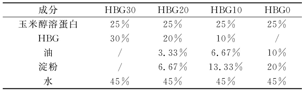 成分HBG30HBG20HBG10HBG0玉米醇溶蛋白25%25%25%25%HBG30%20%10%/油/3.33%6.67%10%淀粉/6.67%13.33%20%水45%45%45%45%
