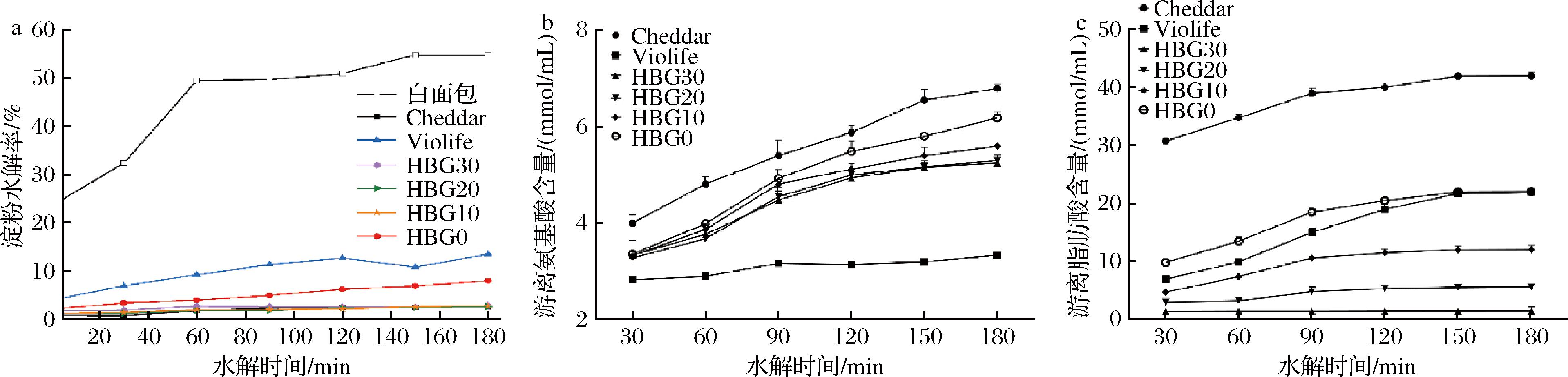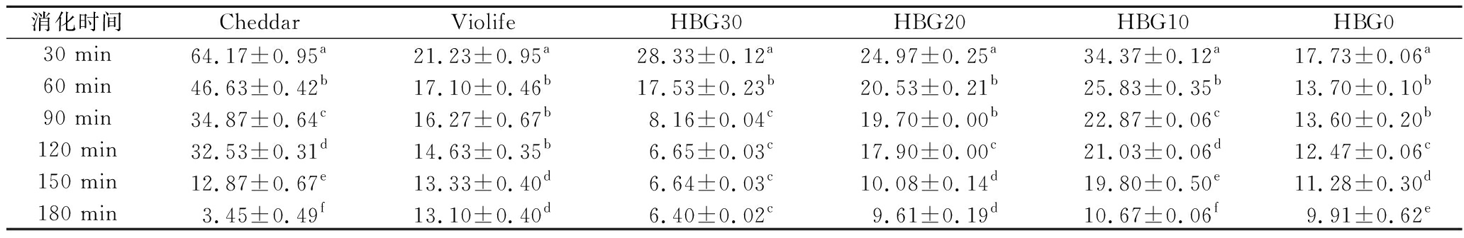 胃半排空时间(t1/2)是衡量食物在胃中停留时间的重要指标,t1/2值越大,表示胃滞留时间越长。β值则用于表示食物在胃内的最终残留量。如表3所示,所有样品在180 min的胃消化过程中均能排出95%以上的内容物(β=0.96%~1.83%)。Cheddar动物奶酪的胃排空时间较短(t1/2=59.04 min),而Violife植物奶酪胃排空时间最长(t1/2=101.06 min),这可能是因为Violife淀粉含量高,食糜黏度增加,从而延缓胃排空[22]。HBG0样品的胃排空时间(t1/2=73.25 min)仅次于Violife植物奶酪[23]。随着HBG添加量增加(从HBG10至HBG30),食糜黏度增加,因此胃排空时间也有所延长(t1/2=50.15~65.87 min)[24]。由图2-a可知,随着消化时间延长,所有样品的淀粉水解率均呈增加趋势。由于Violife植物奶酪和HBG0的淀粉含量较高(表1),其淀粉水解率增加趋势尤为明显。