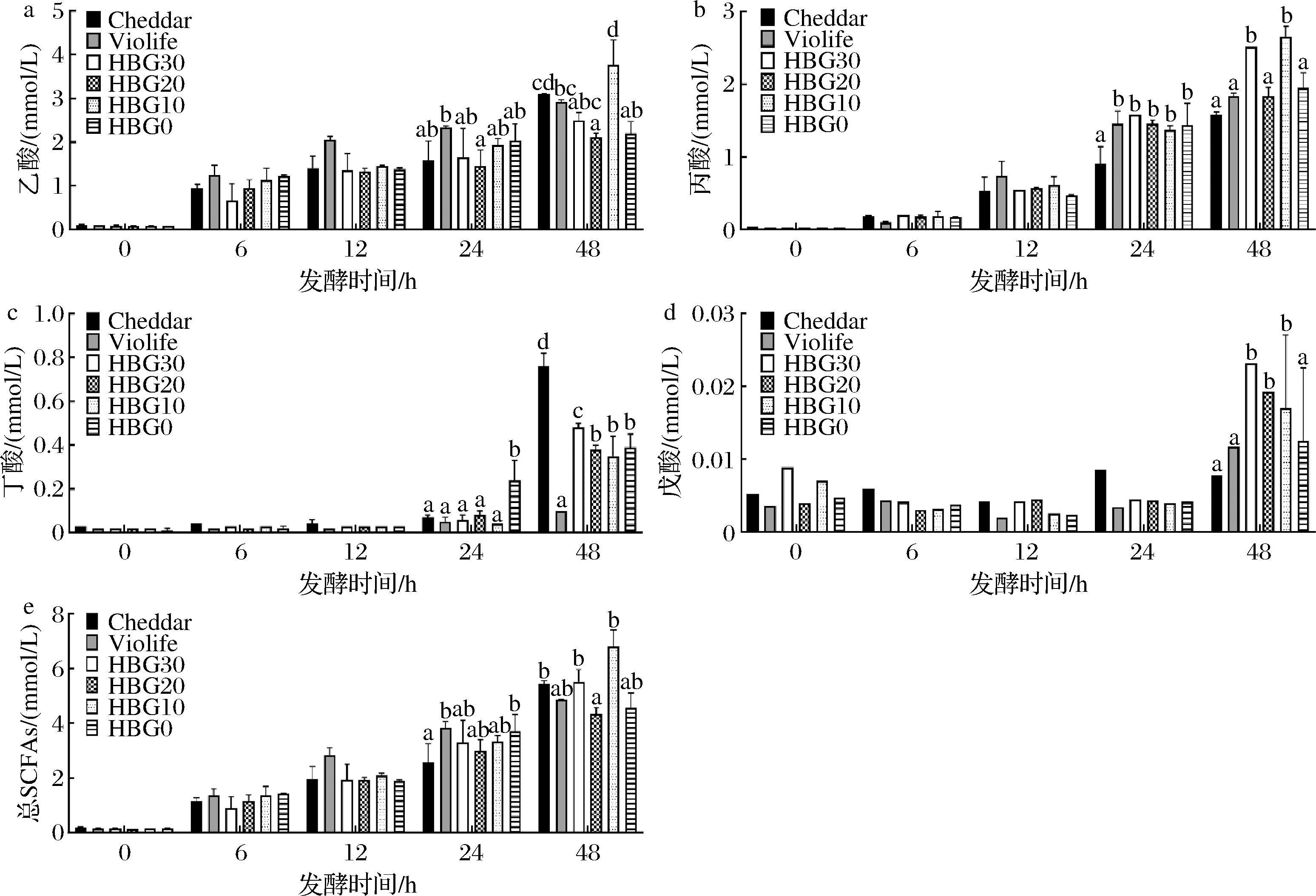 a-乙酸;b-丙酸;c-丁酸;d-戊酸;e-总SCFAs