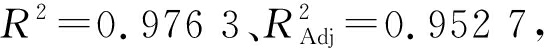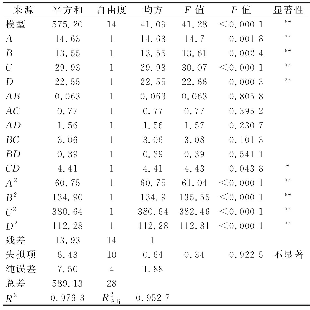 来源平方和自由度均方F值P值显著性模型575.201441.0941.28<0.000 1**A14.63114.6314.70.001 8**B13.55113.5513.610.002 4**C29.93129.9330.07<0.000 1**D22.55122.5522.660.000 3**AB0.06310.0630.0630.805 8AC0.7710.770.770.395 2AD1.5611.561.570.230 7BC3.0613.063.080.101 3BD0.3910.390.390.541 1CD4.4114.414.430.043 8*A260.75160.7561.04<0.000 1**B2134.901134.9135.55<0.000 1**C2380.641380.64382.46<0.000 1**D2112.281112.28112.81<0.000 1**残差13.93141失拟项6.43100.640.340.922 5不显著纯误差7.5041.88总差589.1328R20.976 3R2Adj0.952 7