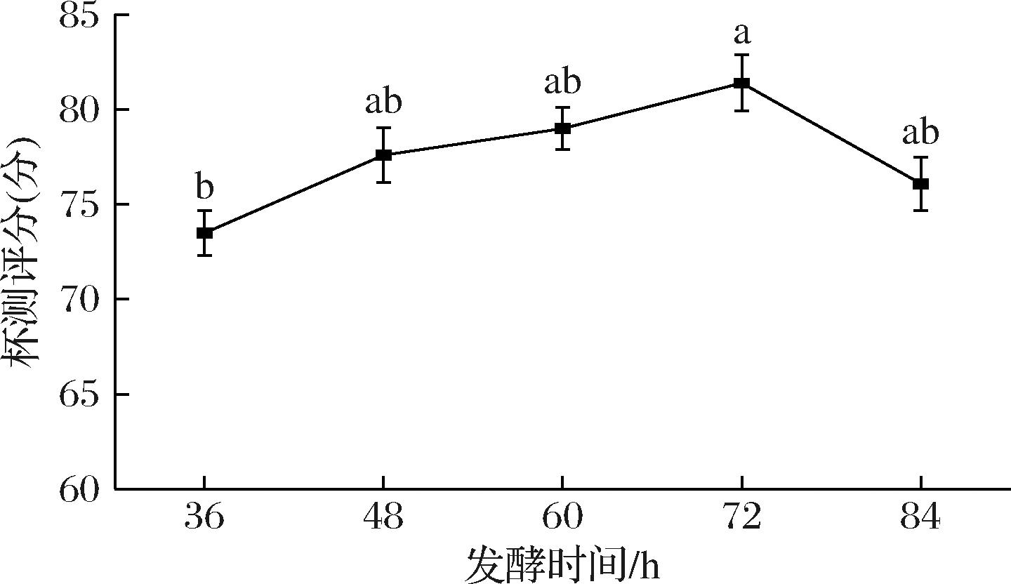 酵母菌在不同生长时间产生的代谢产物量不同,其代谢产物量随着发酵时间的延长而增加。由图3可知,发酵72 h时杯测感官评分最高,咖啡风味最佳,醇厚度最为厚重,整体风味评价最高。发酵时间低于72 h时,花香和咖啡风味融合差,有分离感,咖啡醇厚度单薄;当发酵时间超过72 h时,咖啡豆中的营养物质被微生物大量消耗,尤其是碳水化合物,易造成过度发酵,从而导致咖啡品质下降,杯测时咖啡酸质尖锐且带有水感,所以72 h是最适发酵时间。