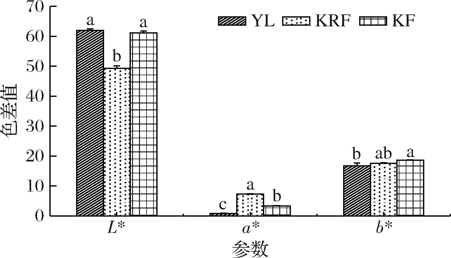 玫瑰花和K.marxianus的共同发酵对咖啡生豆色泽的影响肉眼可见。色泽的变化可用色差仪来评估,L*值越大,咖啡豆的亮度越大,a*值越大,咖啡豆颜色偏红,而b*值越大,则咖啡豆越黄[27]。由图7可知,接种K.marxianus和玫瑰花共同发酵后,咖啡生豆亮度下降;咖啡生豆颜色偏红,呈玫红色,这是由于发酵过程中玫瑰花里的色素得到分解释放,并迁移至咖啡豆中;而咖啡黄蓝度变化较小。