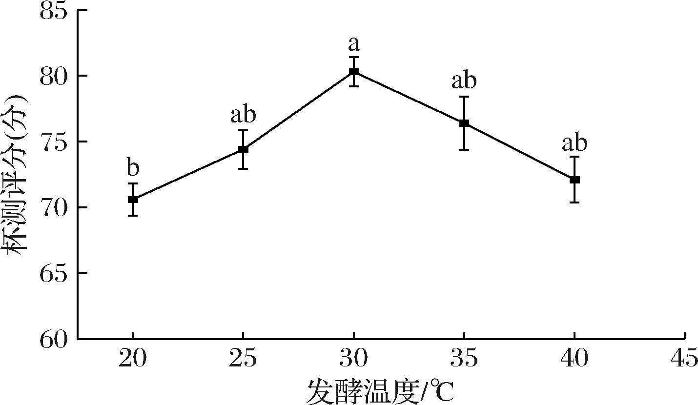 Fig.2 Effect of fermentation temperature on sensory score of rose-flavored coffee