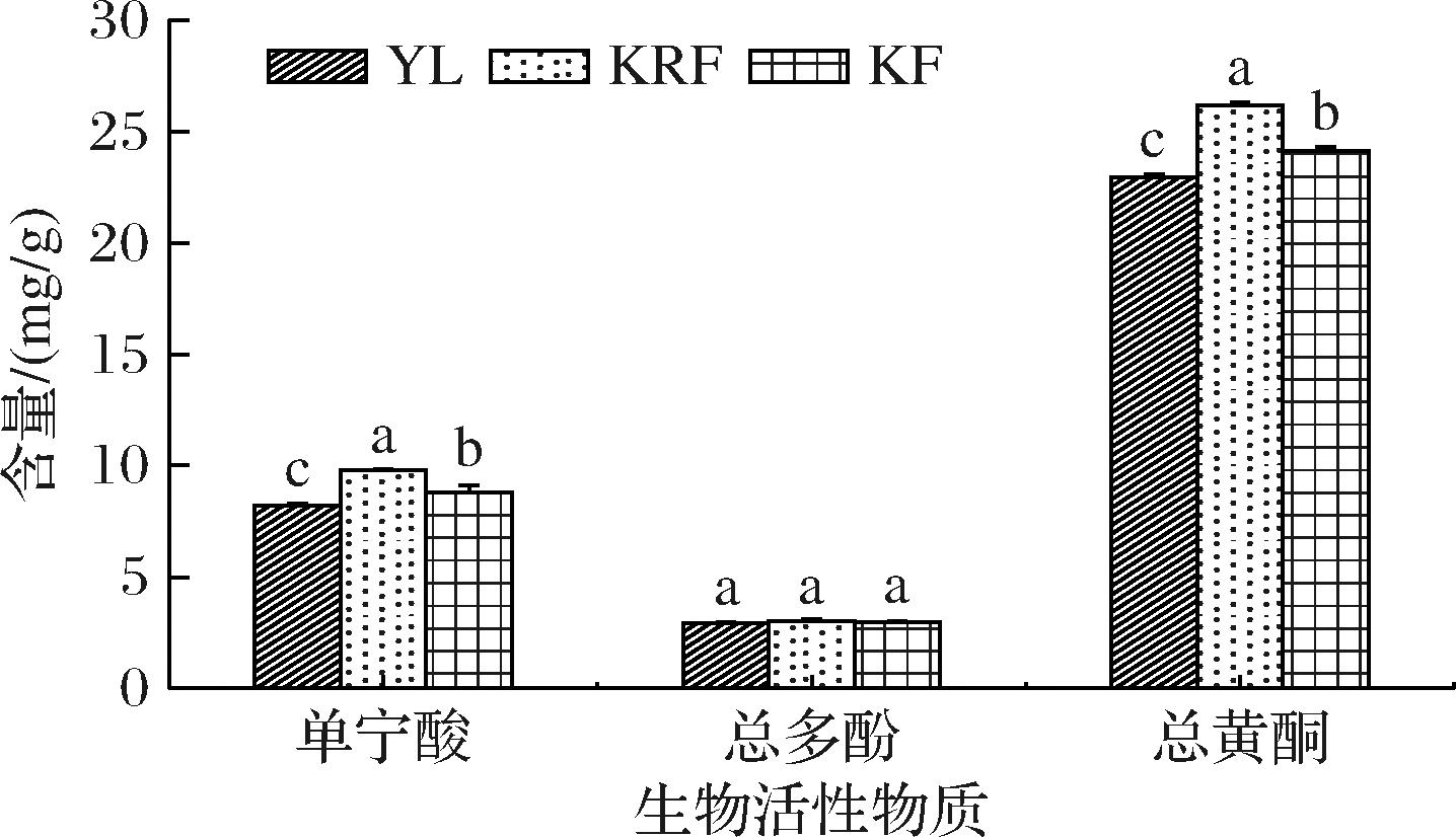 以响应面优化出的最佳工艺进行玫瑰风味咖啡发酵,比较K.marxianus和玫瑰花共同发酵的玫瑰风味咖啡(记为KRF)、K.marxianus发酵的咖啡(记为KF)与原料咖啡(记为YL)生豆的生物活性成分。各咖啡生豆样品中单宁酸、总多酚和总黄酮含量如图6所示。
