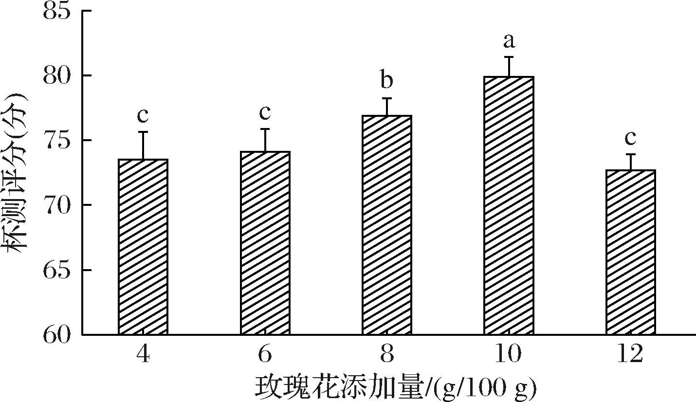 图4 玫瑰花添加量对玫瑰风味咖啡感官评分的影响
