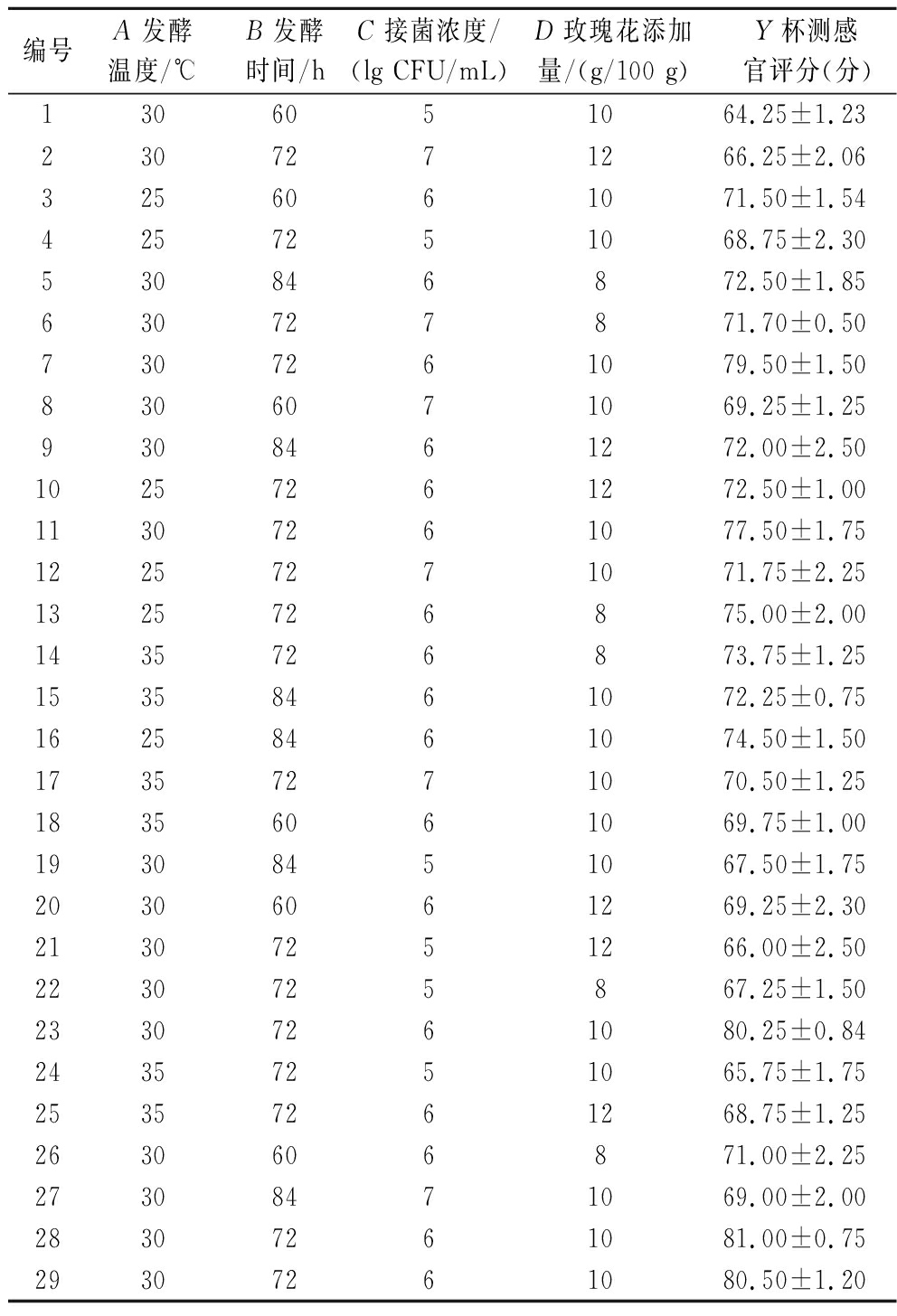 以发酵温度、发酵时间、接菌浓度和玫瑰花添加量为因素,杯测感官评分为响应值进行发酵工艺优化试验。响应面Box-Behnken实验设计及结果见表2。